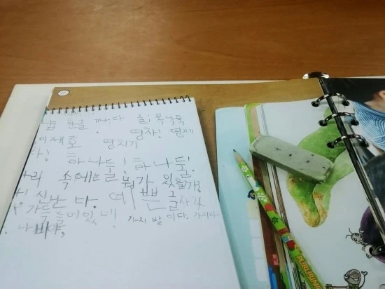 저 글 이후 몇 달이 지난 지금, 저 아이의 글씨는 맞춤법과 띄어쓰기라는 계통에 더 가까워졌다.