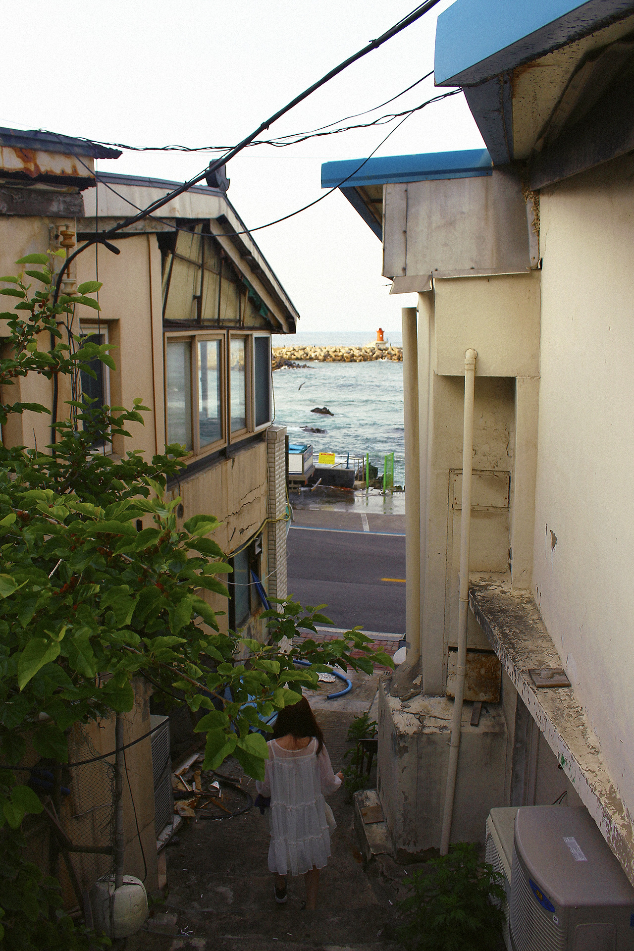 저녁시간이 다 되서 우리는 옷을 갈아입고 밥을 먹기 위해 밖으로 나왔다. 건물 1층에는 숙소 주인이 하는 카페가 있다. 숙소 역시 카페를 통해 올라가야 하기 때문에 카페가 문을 닫는 밤 10시 이후에는 뒷문으로 들어가야만 했다. 우리는 미리 탐방 겸 뒷문으로 나갔다. 이곳으로 잘나왔다 생각이 들만큼 오래된 건물 사이로 보이는 바다가 내 마음에 쏙 들었다.