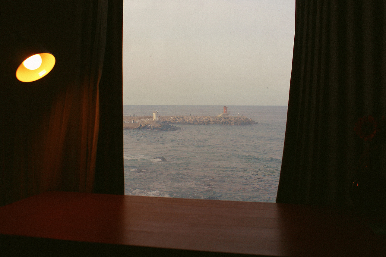 이런저런 얘기를 나누고 잠이 든 우리를 맞이한건 붉은 새벽이었다. 잠결에 일어나보니 동해의 푸른 바다와 붉은 하늘이 커튼을 물들이고 있었다. 사실 이 사진을 찍은 뒤에 다시 잠에 들었다. 너무 피곤한 나머지.