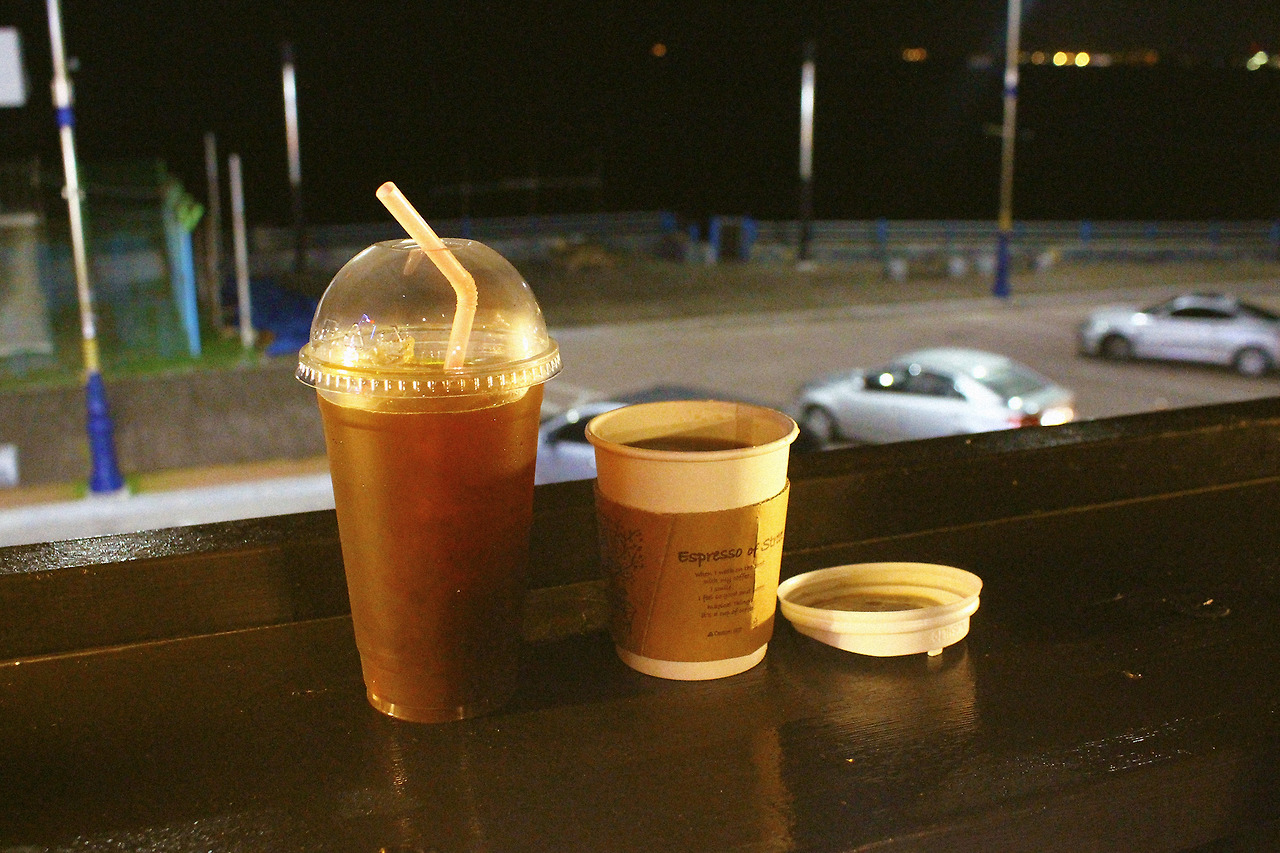 회를 먹고 나오니 이미 바다와 하늘의 수평선은 검게 물들어 보이지 않았다. 횟집 옆에 있던 카페에 잠시 앉아 커피 한 잔 마시며 밤바다 소리를 만끽했다.