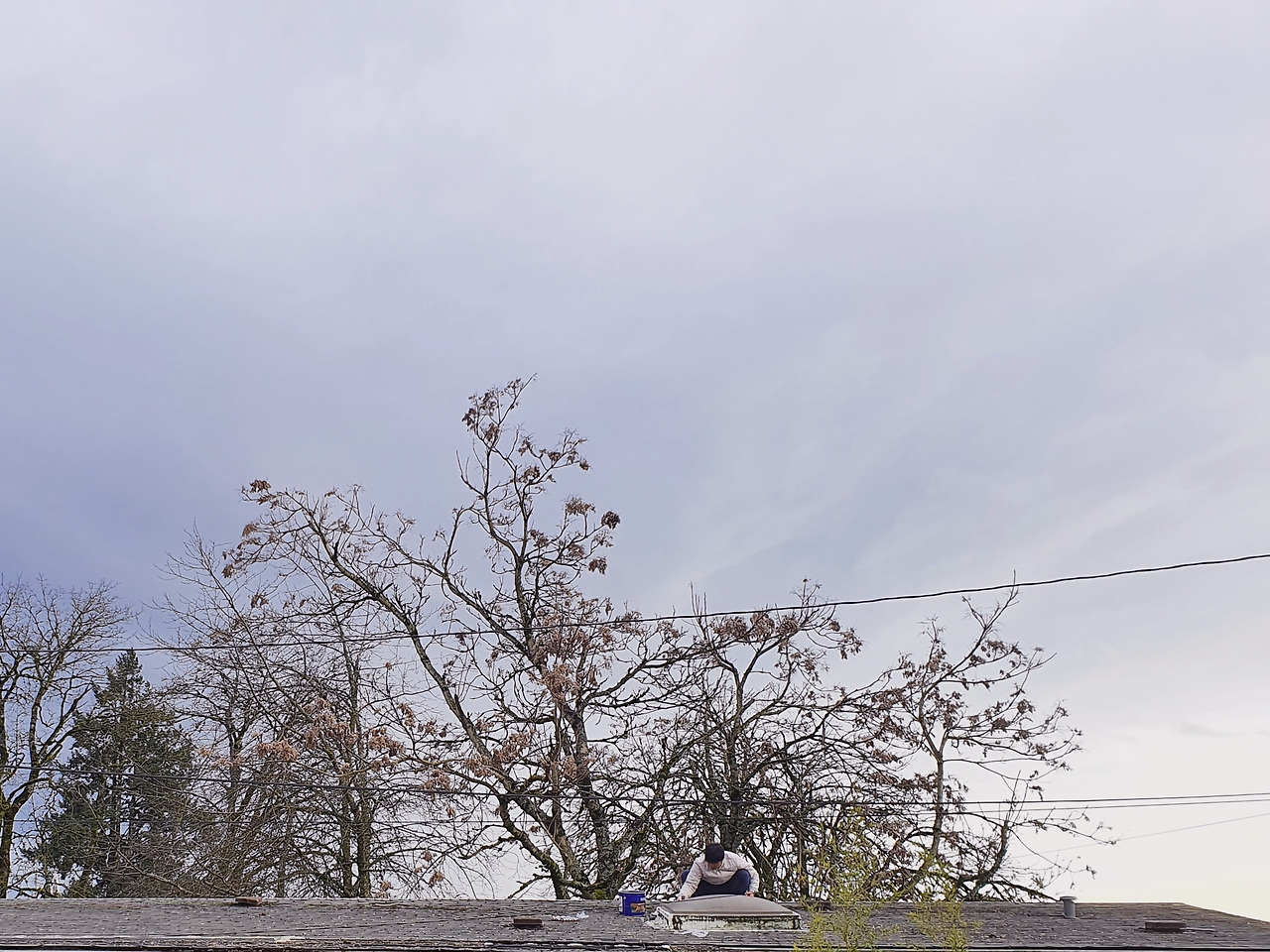 간 밤에 내린 비로 빗물이 모였다. 지붕에 올라가 땜 질을 한다.