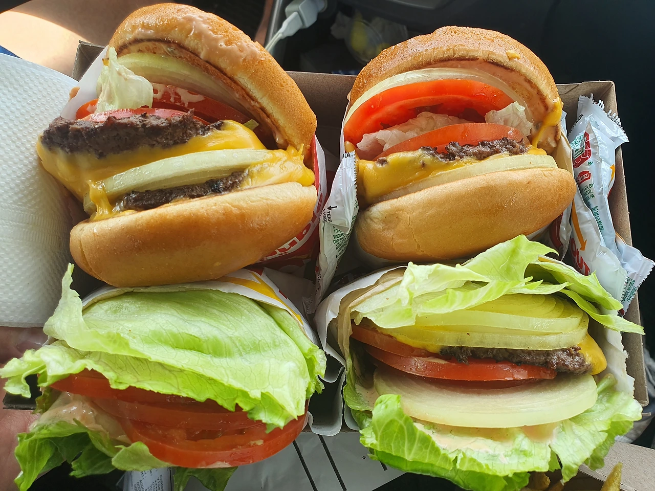 미국 하면 햄버거 아니겠는가? 돌아다니다 보면 여러 프랜차이즈를 만난다. 맥도널드, 버거킹은 물론 오래전 없어진 웬디스도 아직 성행 중이고, 5 가이즈(Five Guys), 낸시 조스(Nancy Jo’s), 버거빌(Burgervil), 데어리 퀸(DQ, Dairy Queen), 잭 인 더 박스(Jack in the Box) 같은 나에겐 처음 보는 브랜드도 있다. 하지만 누가 뭐래도 서부 대표 버거는 인 앤 아웃(In N Out)이다. 미국에 오게 되면 꼭 한 두 번씩은 먹게 되는 가족들의 최애 버거.