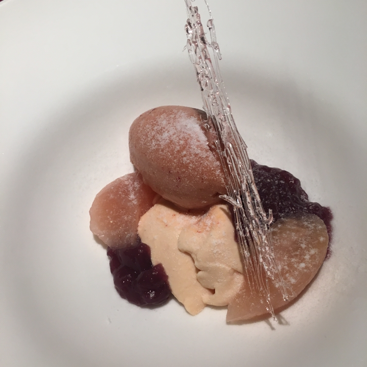마지막으로 나온 복숭아/ 플럼/ 오렌지 등으로 얼리고 샤벳으로 하고 설탕장식까지
