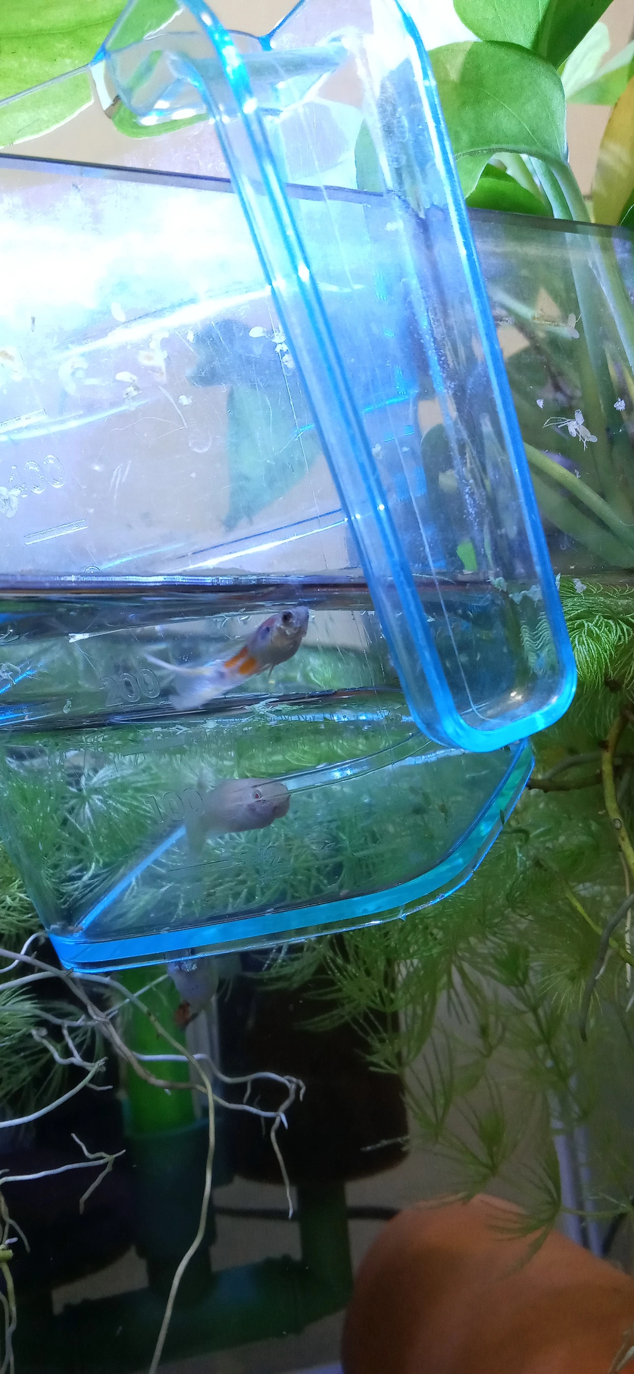 나는 먹이를 줘도 잘 먹지 못하는 암컷을 작은 어항으로 옮겼다. 지금 푸른색 비커병에 들어간 암컷은 온도맞댐(기존의 물과 새로 들어갈 물의 온도를 맞추는 일) 중이다. 곧 스포이드로 작은어항의 물을 넣어주는 물 맞댐후 남은 날들을 이곳에서 조용히 보내게 될것이다.