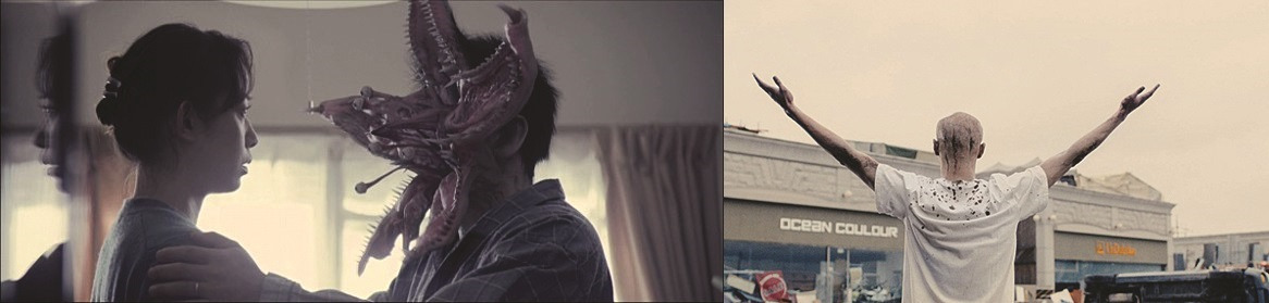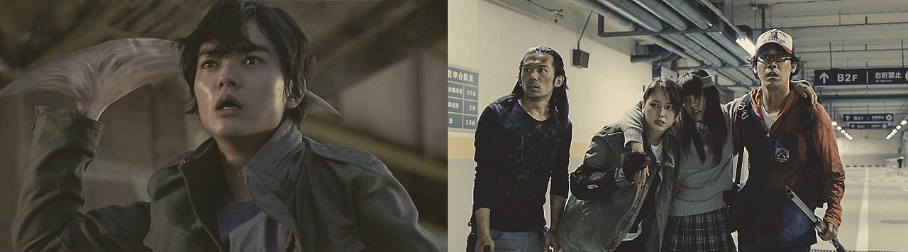<기생수> 시리즈에서 없어서는 안 될 존재인 미기는 소메타니 쇼타가 연기한 신이치와 함께 완벽한 한 몸이 되어 영화 속에서 살아 움직였고, 폭발적인 스피드로 인간들을 위협하는 좀비들의 모습은 <아이 엠 어 히어로>에서 하나의 완벽한 미장센이 되었다. <기생수> 시리즈를 대표하는 잔혹한 비주얼 특히 맨 처음 영화 오프닝에서 기생수에 감염된 남성이 여성의 머리를 통째로 먹는 장면은 정말 말 그대로 만화를 찢고 나온 듯이 재현되었고, 미기와 다른 기생수들 간의 목숨을 건 격투씬들도 위화감 없이 영화 속에서 살아 움직였다. (원작의 백미라 할 수 있는 시청의 대학살 장면이 재현되지 않은 아쉬움은 어쩔 수 없지만) 앞서 언급했던 것처럼 <아이 엠 어 히어로>에서 좀비에게 감염된 뒤 혼란스러운 도쿄의 모습을 담아낸 초반 시퀀스는 마치 내가 히데오가 되어 아비규환 살육 현장 속에 있는 것 같은 리얼함을 선사한다. 또한 좀비만큼 잔악한 인간들의 본성을 그린 쇼핑몰에서 시선을 사로잡은 일명 높이뛰기 좀비는 만화 속에서보다 생동감 넘치는 모습으로 등장인물들과 관객들 모두를 공포로 몰아넣었다. 만화라는 나와 분리된 세계 속에서 진행되는 것만 같았던 공포스러운 이미지들은 영화를 통해 스크린 속에서 최대한 사실적으로 재현되었고 관객들은 이미지들이 더 이상 상상 속에서만 존재하는 것이 아닌 실제로 내 눈앞에서 펼쳐지고 있는 것 같은 인상을 받으며 더욱 영화에 몰입해 큰 공포감을 느끼게 된다.