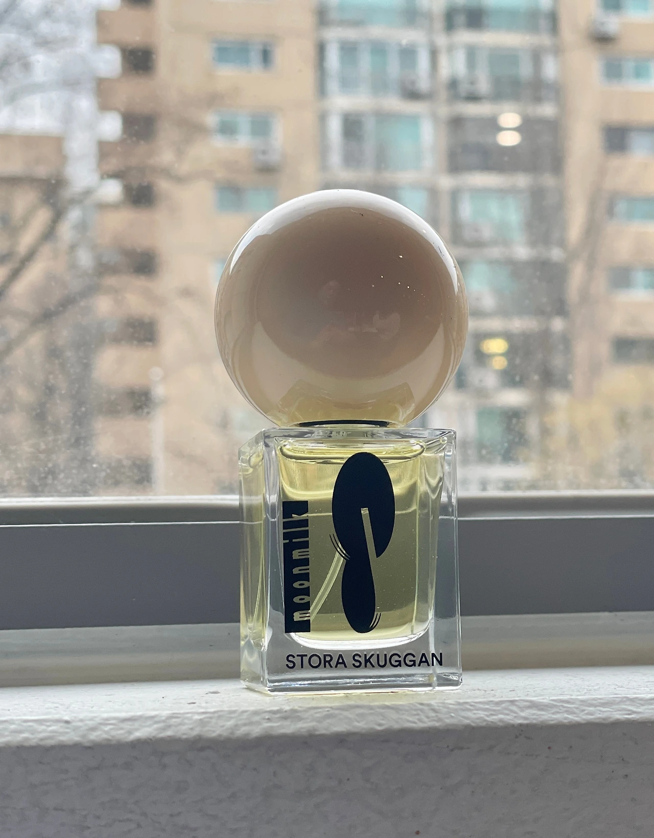 SNS를 통해서 어렴풋이 존재만 인지하고 있었던 브랜드였기에 리퀴드 퍼퓸바 도슨트 투어에서 가장 궁금했던 브랜드의 향들을 실컷 경험하고 왔다. 사실 이 스토라 스쿠간은 우리나라 향수 시장에서 메인 스트림에 오를 만큼 대중적인 취향을 담고 있는 브랜드는 아니다. 브랜드 자체가 디자인 학교에 재학 중이던 다섯 명 예술가들의 협업 프로젝트에서 출발한 만큼, 향 자체가 실험적인 면모를 많이 띈다. 이 브랜드의 여러 향들을 맡아보았는데 대부분의 향들은 뿌리고 다닐 엄두를 내지 못할 만큼 말 그대로 매니악한 향들이 가득했다. 독특한 병 모양에서부터 관심이 생긴 브랜드였는데, 막상 그 향의 독특함에 엄두를 내지 못하고 있을 때 딱 하나 마음이 가는 향이 있었는데 그게 바로 ‘문밀크’였다.