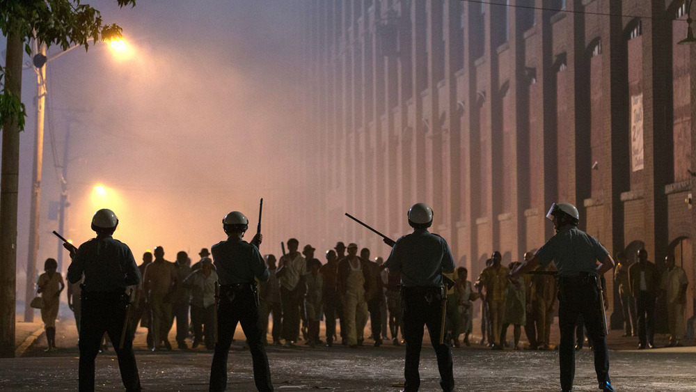 <디트로이트>는 사실 영화 자체가 다루고 있는 소재만큼이나 묵직한 영화이다. 영화는 초반부터 디트로이트에서 벌어진 사건들을 상세히 묘사한다. 이 폭동이 벌어지기 전까지 어떠한 사건들이 벌어지는지, 사람들이 그곳에서 어떠한 일들을 겪는지. 영화의 주요 사건이 시작되는 지점은 영화가 시작한 뒤, 꽤 시간이 흐른 뒤 등장하는데 영화는 이 사건을 정확하게 보여주기 위해 사전의 배경들을 세밀하게 묘사한다. 특히 애니메이션으로 디트로이트의 상황을 보여주는 오프닝 이후 등장하는 술집에서의 일들은 그 당시 흑인들이 느낄 수밖에 없었던 불안함과 분노의 시작을 보여준다는 점에서 상기할만하다. 보여주기 식 수사를 위해 술집을 급습하지만, 술집의 뒷문이 잠겨 있어서 경찰들은 어쩔 수 없이 흑인들을 앞문으로 데리고 나오고 단순히 파티를 벌이는 것임에도 이를 무자비하게 잡아가는 경찰들의 모습을 보면서 흑인들의 분노는 극에 달하기 시작한다. 수많은 인원들을 경찰서에 데리고 가기 위해 수송차가 계속해서 충원될 때, 이들의 모습을 지켜보는 흑인들의 분노가 더욱 커져가고 이러한 긴장과 불안감을 카메라는 끊임없이 포착한다. ‘무슨 일이 벌어질지도 모른다’는 긴장감이 <디트로이트> 전체를 지배하는데, 이는 정말로 어떠한 일이 벌어졌을 때 더욱더 집요하게 현장을 파헤치면서 말 그대로 숨 막히는 느낌을 선사한다. 이를 통해서 어떻게 디트로이트라는 대도시가 흑인들의 지옥이 되었는지, 흑인들의 분노가 어떻게 폭발하기 작하는지에 대해 하나하나 점층적으로 층위를 쌓아나간다.