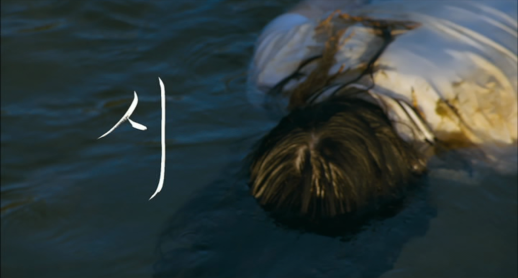 <시>의 오프닝 장면은 이창동 감독의 다른 어떤 영화보다 특별하다. 이창동 감독은 영화에서 보통 초반에는 아무렇지 않은 일상으로 시작하다가 그 표면 아래 감춰진 다른 것들을 들춰내는 방식으로 진행하는 경향이 강하다. 이와 달리 <시>는 초반부터 일상적인 삶의 표면 아래에 있는 것을 드러내 보인다. 한 평화로운 시골의 강가에서 여러 명의 소년들이 놀고 있다. 그중 한 소년이 강에서 무언가가 떠내려오는 것을 발견한다. 소년은 강가로 가까이 다가가고, 강물에 따라 소녀의 시체가 떠내려온다. 그 시체 옆으로 타이틀 <시>가 떠오른다. 시체와 타이틀 '시'의 대비는 끔찍할 정도로 냉정해 보인다. 소녀의 시체는 영화 후반부에 드러나는 미자의 ‘시’와 연결된다. 소녀의 죽은 몸은 그 자체로 소녀가 세상을 향해 보내는 하나의 ‘언어’이다. 그렇지만 이 소녀의 이름이 무엇인지, 어떤 삶을 살았는지 영화는 첫 시작에서는 어떠한 정보도 제공해주지 않는다. 이 현실의 끔찍함을 여과 없이 보여주면서 영화는 우리가 진정으로 마주해야 할 고통의 민낯을 가장 적나라하게 보여준다.