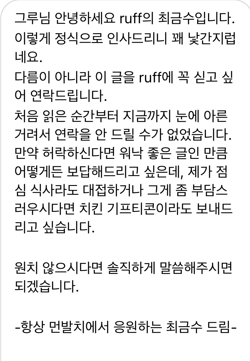 이 글을 계기로 러프 매거진의 정호님과 서로 팔로우를 하게 되었다. 이후로 러프 매거진 계정 주인이 내 스토리에 좋아요를 누르는 현상을 발견할 수 있었다. 이때까진 정호님이 베일에 가려진 ‘최금수’인 줄 알았다. (금수님 혹시라도 보고 있다면 님 자는 조금만 있다 붙일게요)