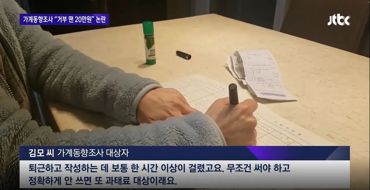 제보자를 직접 만나보니 김모씨는 맞벌이를 하는 회사원이었다. 어느 날 통계청 조사원이 찾아오더니 새해부터 매일 가계부를 써서 한 달에 한 번씩 제출하라고 통보했다고 한다. 김씨가 해보니 하루에 약 1시간씩 걸리는 번거로운 일이었다. 요즘 카드 사용 내역은 문자메시지나 이메일로 받는데, 손으로 가계부를 쓰고 일일이 영수증도 붙여야 했기 때문이다. 김씨는 조사원에게 못하겠다고 말 했지만, "거부하면 과태료 대상이다"는 통보에 울며 겨자 먹기로 매일 하고 있다고 말하면서 분통을 터뜨렸다.