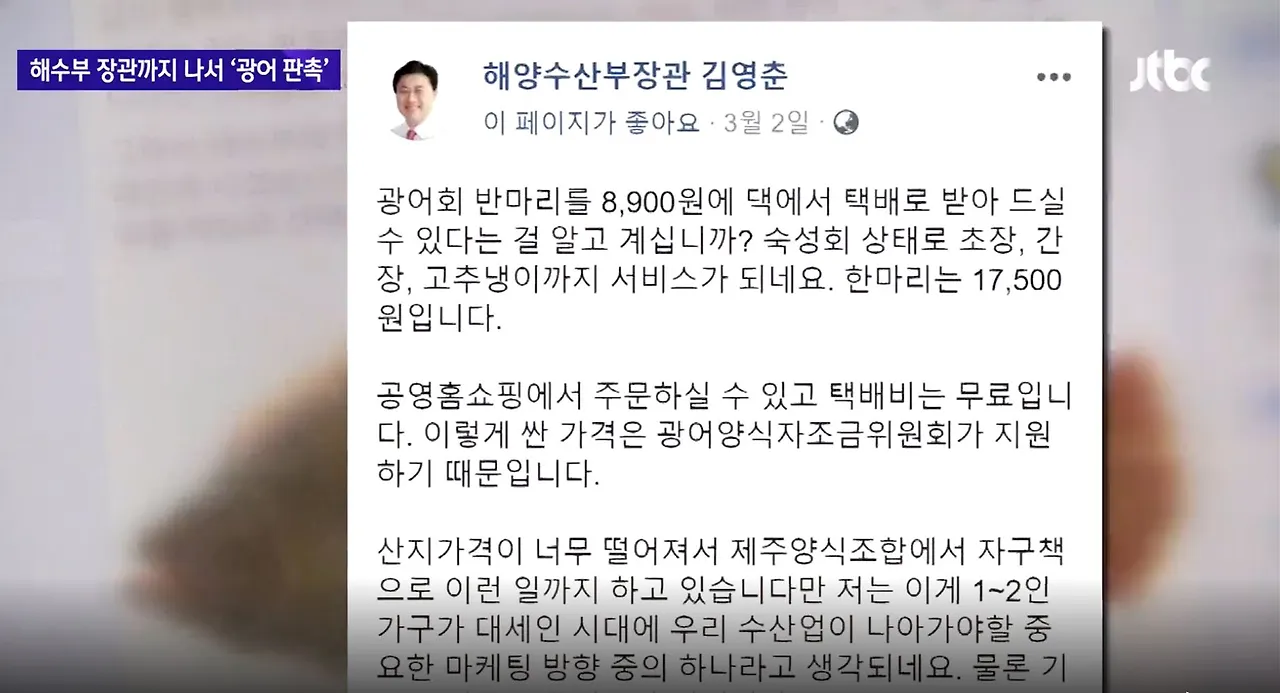 2019년 3월 김영춘 당시 해양수산부 장관이 자신의 페이스북에서 난데없이 광어 홍보 사진을 올리기 시작했다. 한 홈쇼핑에서 광어회를 반 마리에 8900원에 파는데 택배비도 무료니 많이 주문해달라는 내용이었다.