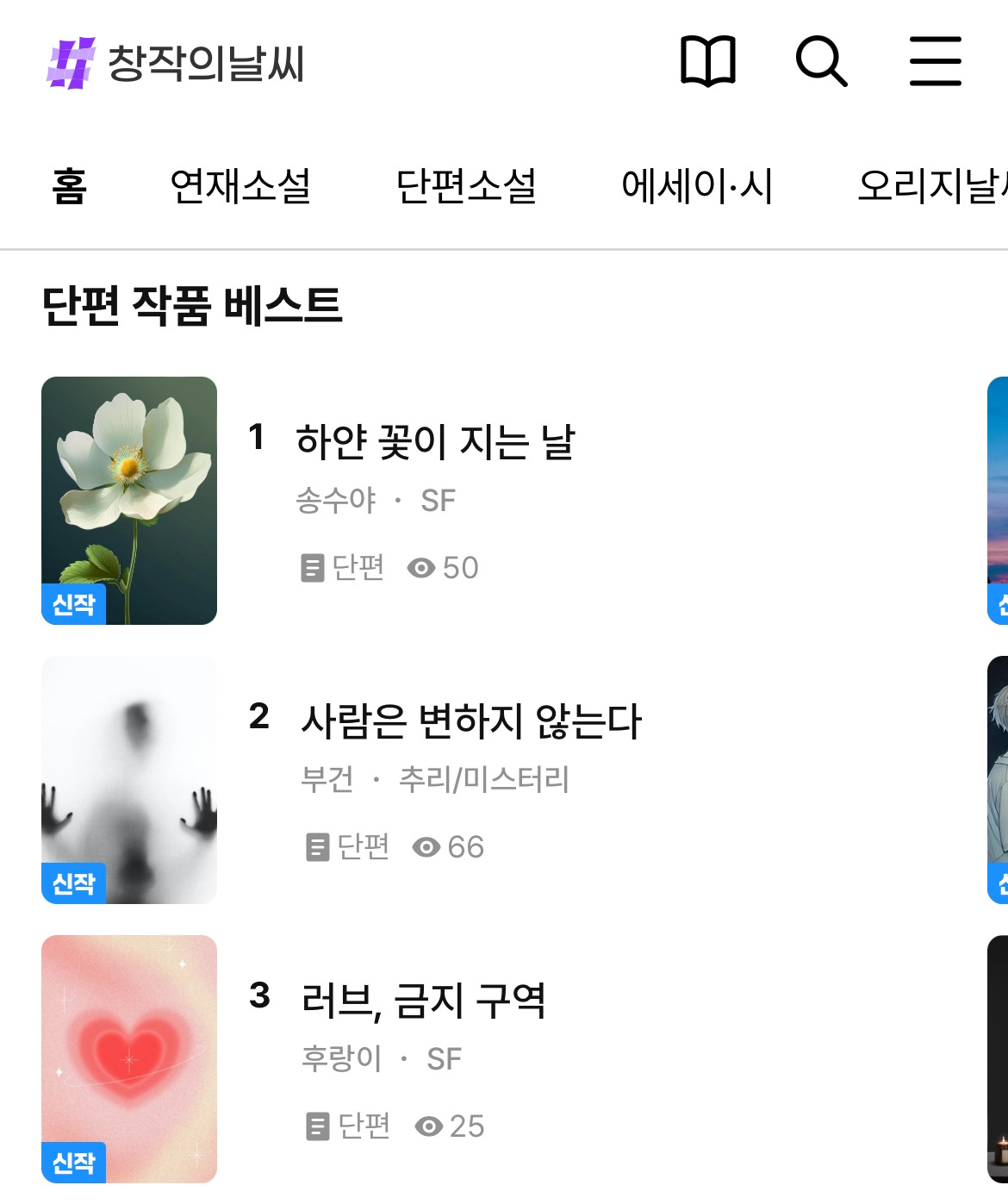단편 작품 베스트 1위에 오르며, 120명 중 최대 6위까지 작품이 올랐다.