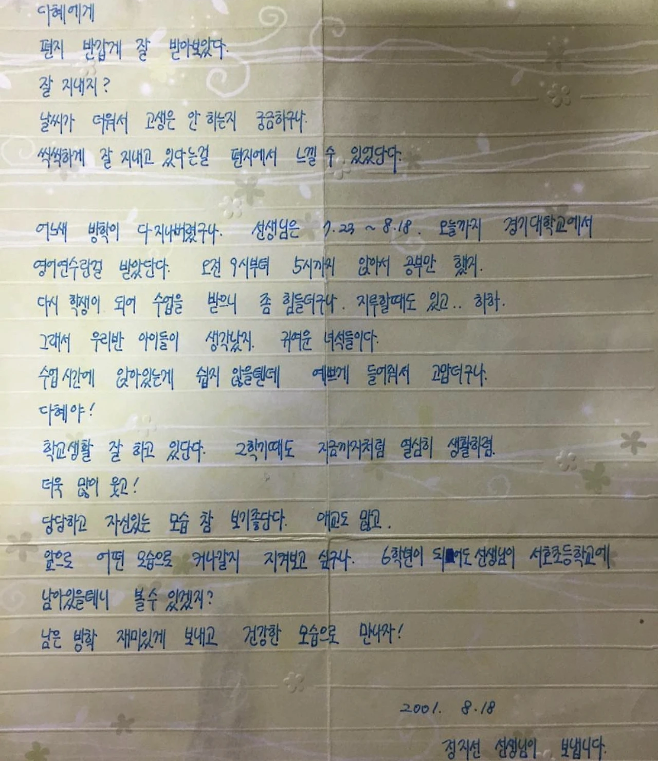 앞으로 어떤 모습으로 커나갈지 지켜보고 싶구나. 6학년이 되어도 선생님이 학교에