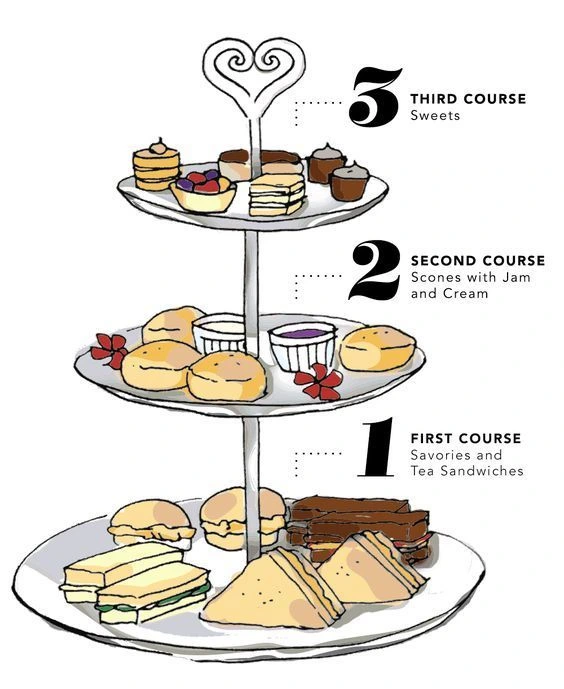 예전에는 스콘이 따뜻하게 유지되도록 가장 위칸에 놓고 돔으로 덮었다고 하는데, 언제부턴가 스콘은 2층으로~~ 아래에서 위칸으로 갈수록 점점 달콤함을 즐길 수 있도록 하고, 맨 위층의 티푸드 들이 화려하기 때문에 그렇게 놓지 않았을까 싶습니다.