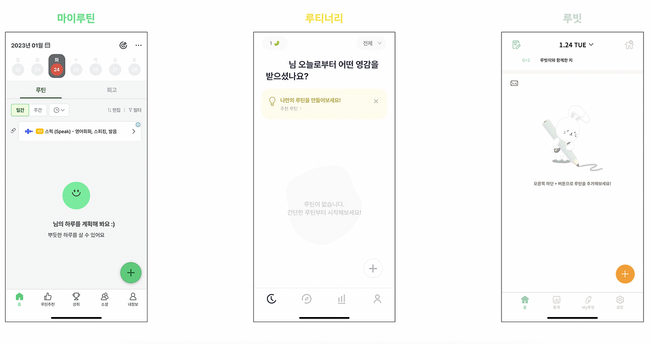 메인화면에는 새로운 루틴을 생성할 수 있는 + 버튼이 우측 하단에 존재한다는 것, 루틴 진행 상황에 대한 통계를 제공한다는 등의 공통점이 존재합니다. 반면 각 서비스가 메인화면의 문구를 통해 제시하고자 하는 '루틴의 첫 느낌'이 다르다는 것을 확인할 수 있었습니다. 마이루틴은 루틴을 생성하고 수행하는 경험을 통해 사용자가 뿌듯한 삶을 살 수 있다는 것을 강조하고 있으며, 루티너리의 경우 간단한 루틴이라는 문구를 활용해 루틴을 생성하고 수행하는 과정에 대해 사용자가 느낄 수 있는 심리적 진입 장벽을 해소하고자 한 것으로 보입니다. 루빗은 루빗만의 특별한 문구가 있지는 않지만 우측 하단에 있는 + 버튼의 기능을 설명하는 동시에 캐릭터 이미지를 활용해 루빗에 대해 친근함을 느낄 수 있도록 설계되었습니다.