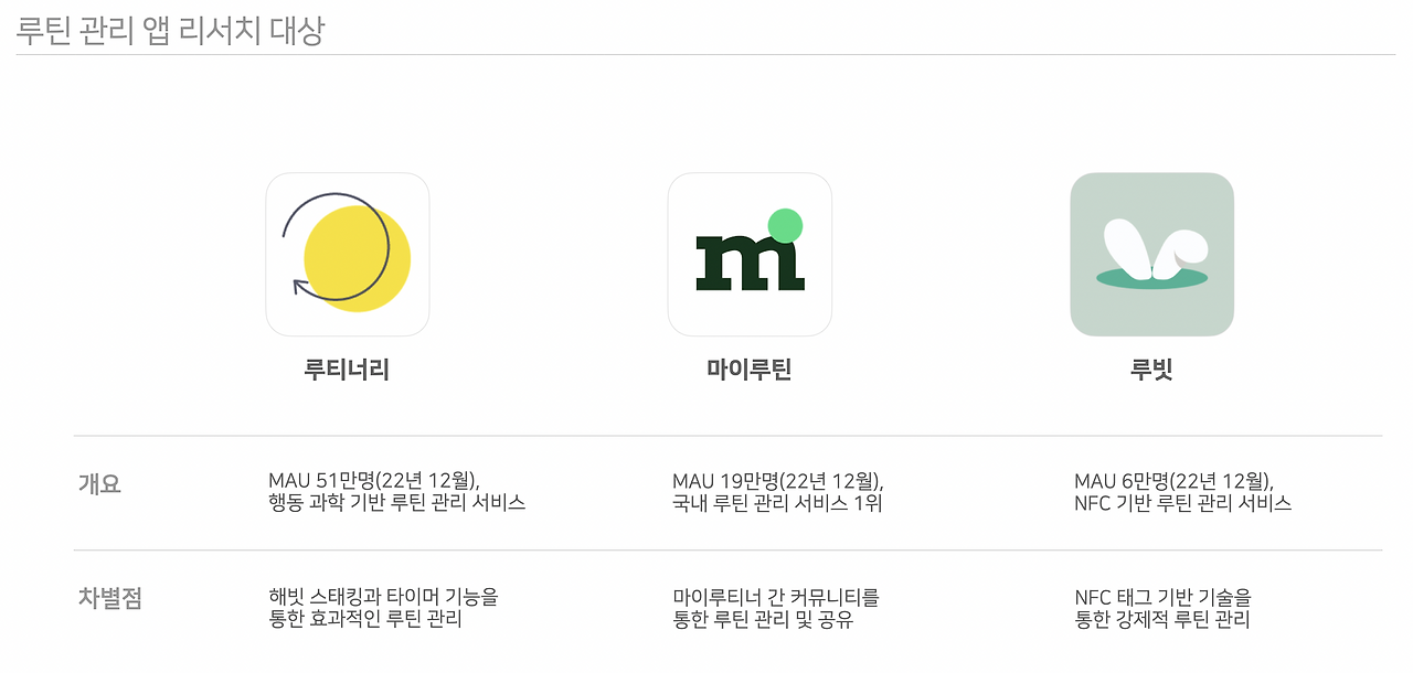 혁신의 숲, Appstore 검색 결과, 뉴스 등을 리서치 해 분석할 루틴 관리 앱을 리서치했으며 서비스 출시 목적, 실제 기능을 기반으로 루티너리, 마이루틴, 루빗 3가지 서비스를 선정했습니다.