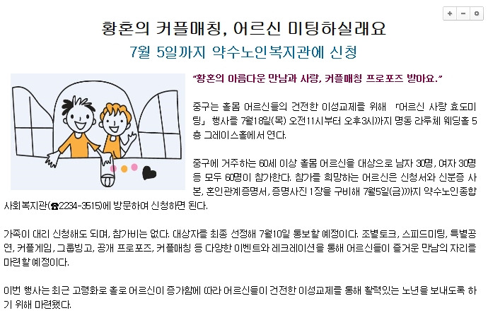뿐만 아니라 단발성이더라도 노인의 성과 관련된 프로그램들을 보았을 때 무언가를 배우고 생산하고 경제활동을 하는 프로그램들과는 달리 청춘이라는 키워드를 전혀 사용하고 있지 않다는 점도 주목해볼 만하다. 실제로 일하는 노인, 행복한 나주라는 슬로건을 내놓으며 나주시에서 주최한 노인사회활동 활성화 대회는 청춘축제라는 이름으로 불리고 한국노인인력개발원의 슬로건은 청춘, 가슴에 피는 꽃인데 반해 노인들을 대상으로 한 미팅의 경우에는 노년의 로맨스, 독거노인 단체미팅, 황혼의 커플매칭 등 비교적 무미건조하며 청춘의 이미지를 전혀 내포하고 있지 않다는 것을 볼 수 있다. 이는 일부가 아닌 대부분의 기사나 홍보자료에서 보이는 모습으로 주류 집단과 주류사회가 노인을 청춘으로 명명하는 데에 있어 지나치게 선택적이지 않은가라는 생각을 하게 만드는 지점이다.