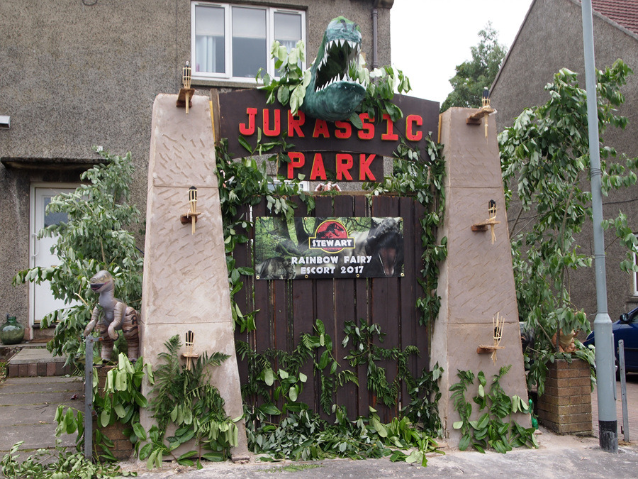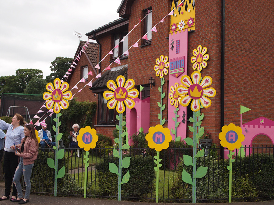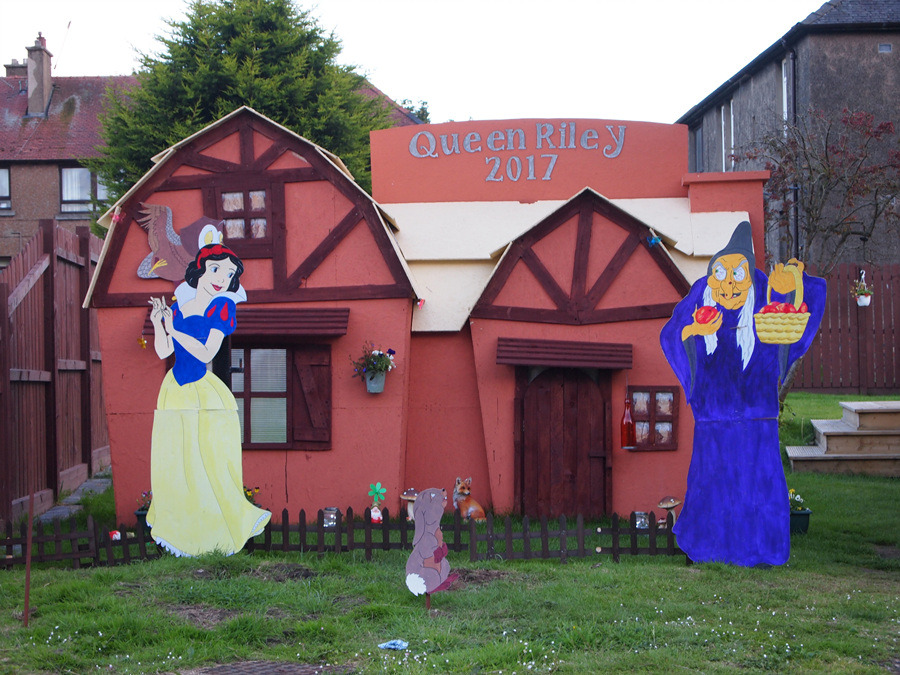 광장에서 여왕 대관식에 참가하지 않은 주민들도 행렬이 마을에 들어서자 모두 나와 손을 흔들고 환호했다. 몇몇은 스코틀랜드 깃발을 흔들기도 했다. 2016년과 마찬가지로 마을 곳곳에는 앞뜰을 꾸며 놓은 집들이 많았다. 작년엔 몰랐는데 메시지를 보니 어린이 퍼레이드에 참가하는 집에서 자기 아이 참가 기념으로 집을 꾸며 놓은 것이었다. 우리 집도 딸들이 두 명이나 참가했으니 꾸몄으면 좋았겠지만...! 나는 그걸 몰랐다. 알았어도 엄두가 안 날 일이긴 했다. 아래 사진을 보시라.