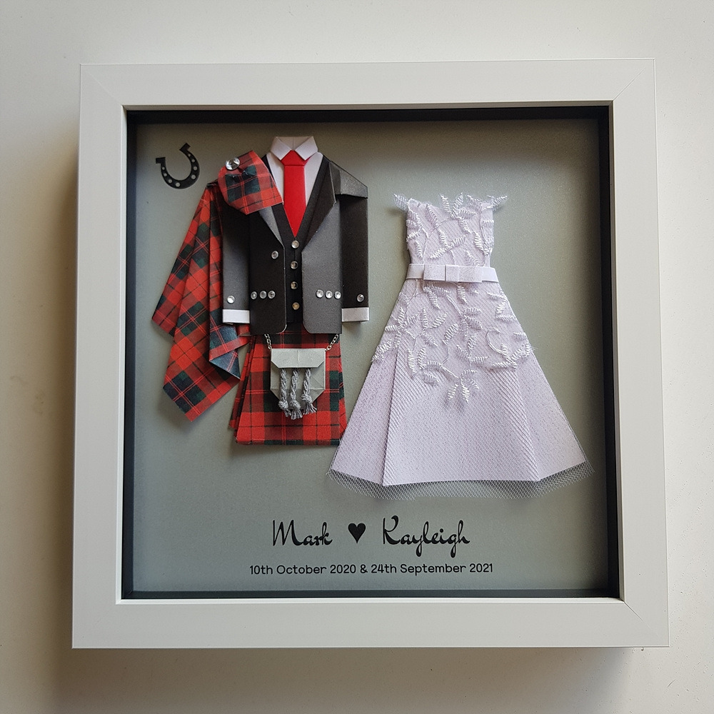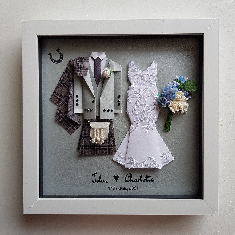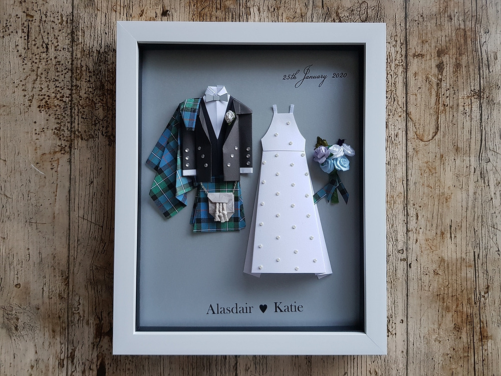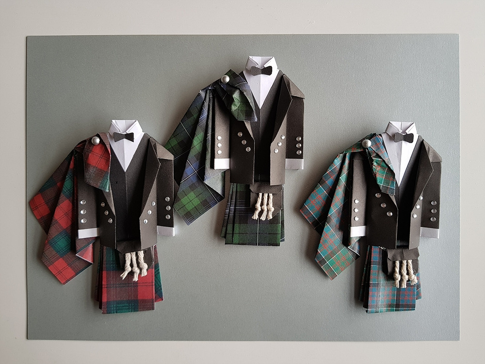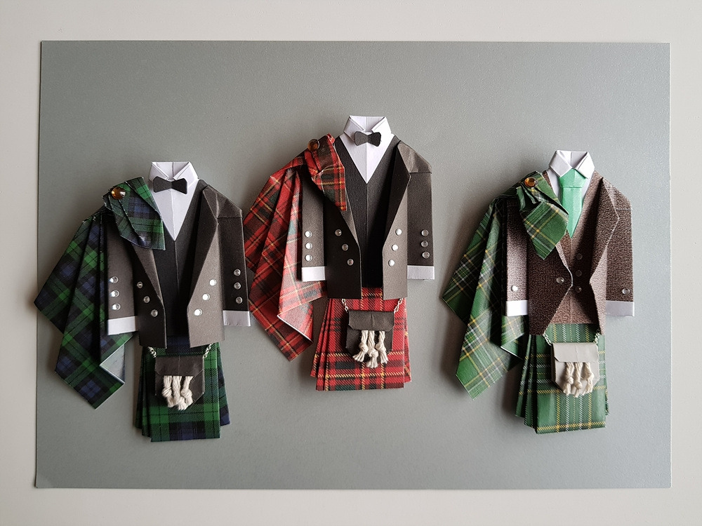 그것의 또 하나의 특징은 치마가 모두 체크무늬라는 점이다. 이 나라에서는 그걸 '타르탄'이라 부른다. 처음 결혼식 종이접기 선물을 만들었을 때 다른 것은 종이로 접었지만 치마 부분은 오래된 나의 체크무늬 남방을 잘라서 만들었다. 하지만 곧 알게 되었다. 스코틀랜드에는 가문마다 고유한 타르탄 무니가 있다는 것을. 결혼식 때는 그 무늬로 된 킬트를 입고 하는 것이다. 아이디어를 얻어 고객이 입은 것과 똑같은 타르탄 무늬를 인터넷에서 찾아 포토샵으로 별도 편집을 해 인쇄했다. 그걸 접어 킬트를 만들었더니 생각했던 것보다 더 열광적인 반응을 얻었다. 가문과 전통을 중요하게 생각하는 그들은 감사인사를 반복하며 어메이징! 원더풀! 판타스틱! 러블리! 영어로 된 좋은 표현을 내 작품에 갖다 붙였다.