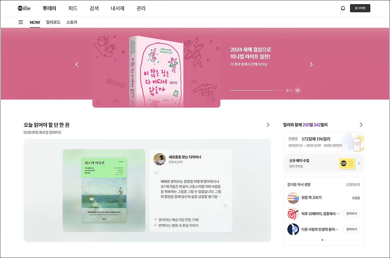 밀리의 서재 첫 화면에서도 1월 9일과 10일 홍보 배너가 떠 있을 예정이랍니다. 저도 책임감을 느끼며 홍보를 열심히 해 보려고요. ^^