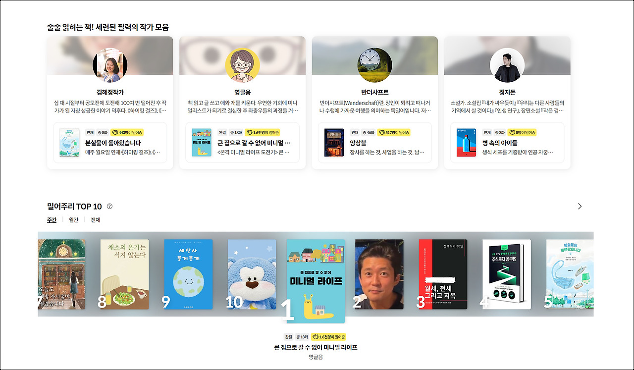 밀리로드 첫 화면에는 세상에... 제가 세련된 필력의 작가 모음 중 하나로 들어가 있기도 합니다. 출간 직전이라 그런지 이번에는 주간 1위가 되었네요.