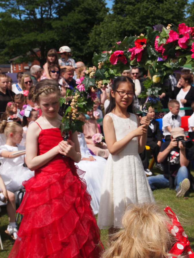 왼쪽 사진 - 바우걸을 맡고 있는 첫째 딸 - 여왕이 지나가는 아치장식을 행사 내내 들고 있어야 한다