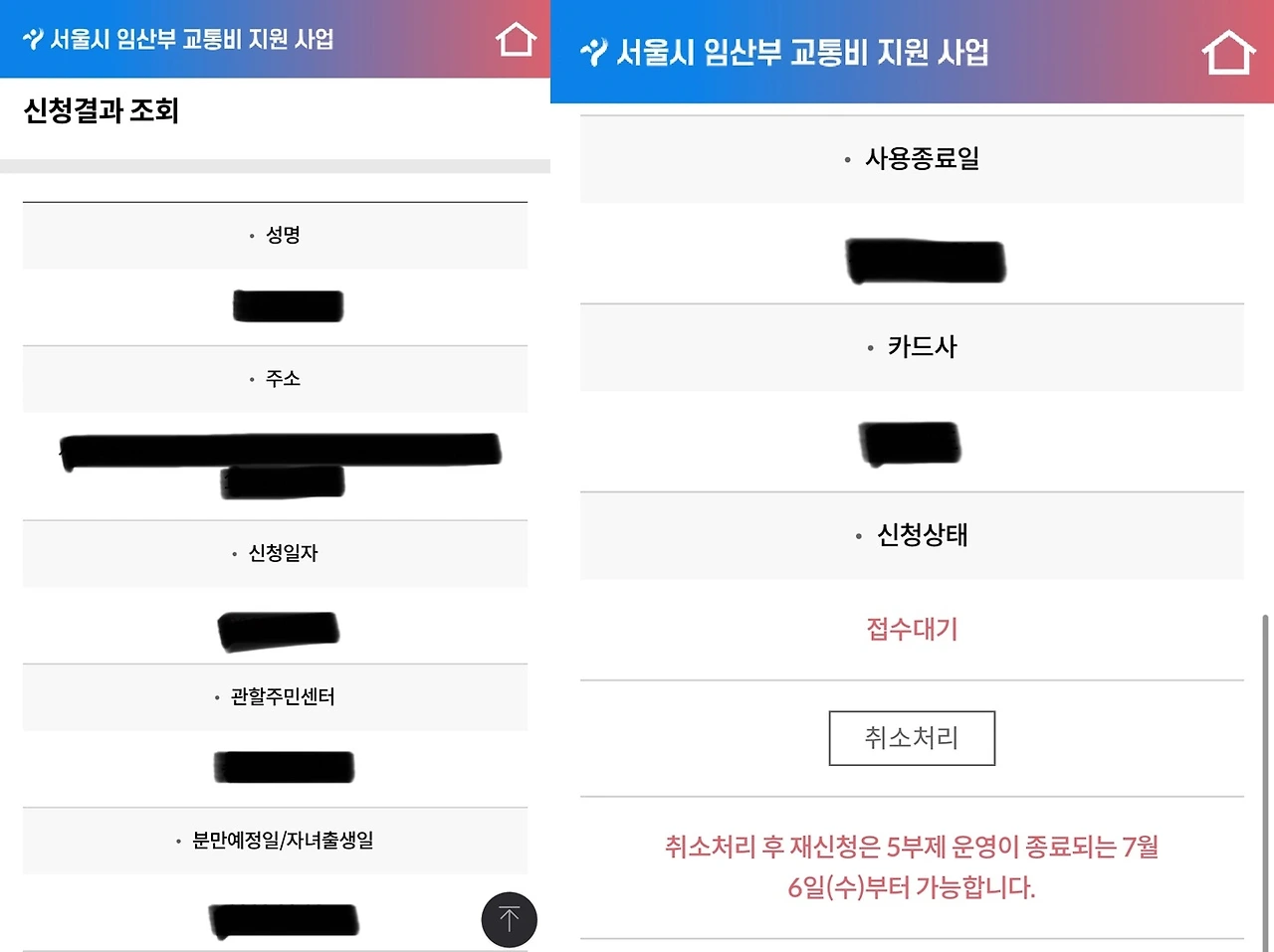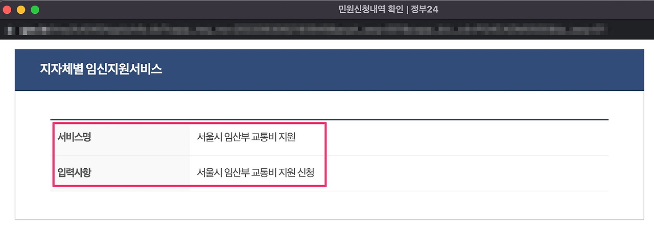 민원신청내역 상세조회 - 접수 목록의 '맘편한 임신 서비스'를 누르면 내가 신청한 상세 항목들이 나오는데 지자체별 임신지원서비스에 서울시 임산부 교통비 지원이 있다.