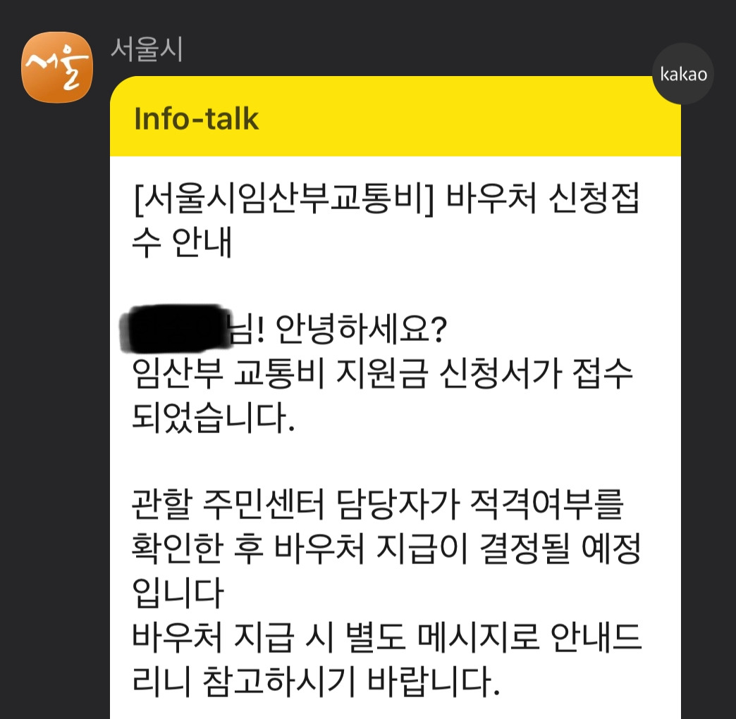 서울시 임산부 교통비 지원 사이트에서 신청을 완료하고 나니 바로 서울시에서 카톡이 도착했다. 잘 접수되었고 관할 주민센터에서 확인한 후에 바우처가 지급될 거란 안내였다.