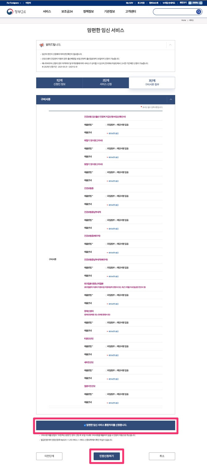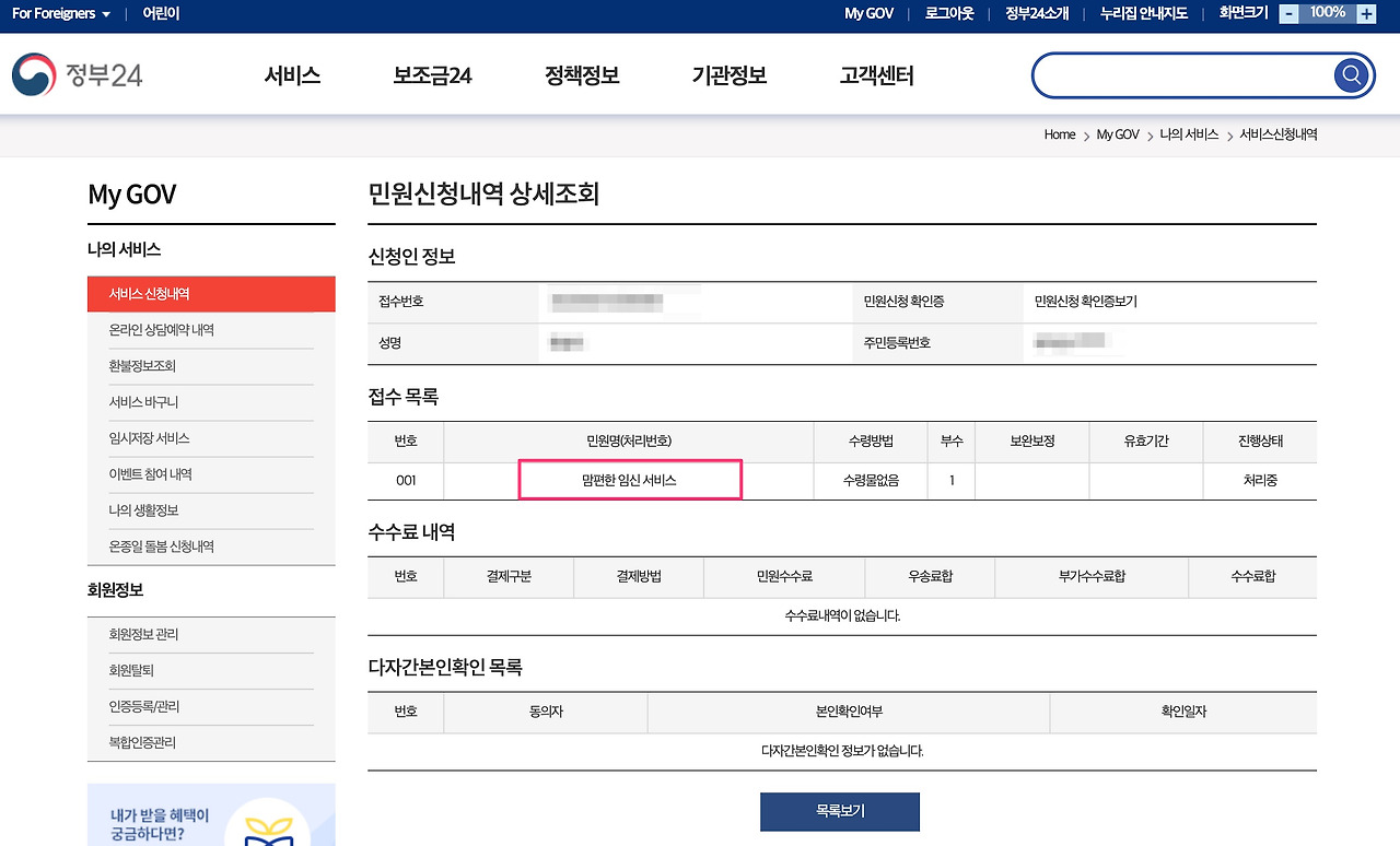 맨 마지막 구비서류 첨부에서는 모두 해당사항 없음이라 별도의 서류는 첨부하지 않아도 되었다. '맘편한 임신 서비스 통합처리를 신청합니다'에 체크하고 민원신청하기 버튼을 누르자 민원신청내역 상세조회 페이지로 넘어갔는데 접수 목록에서 잘 접수된 것을 확인할 수 있었다.