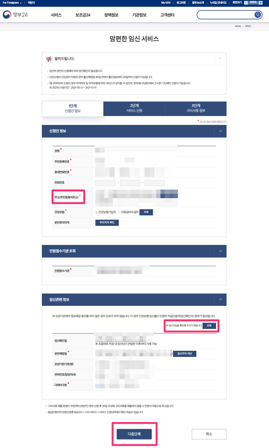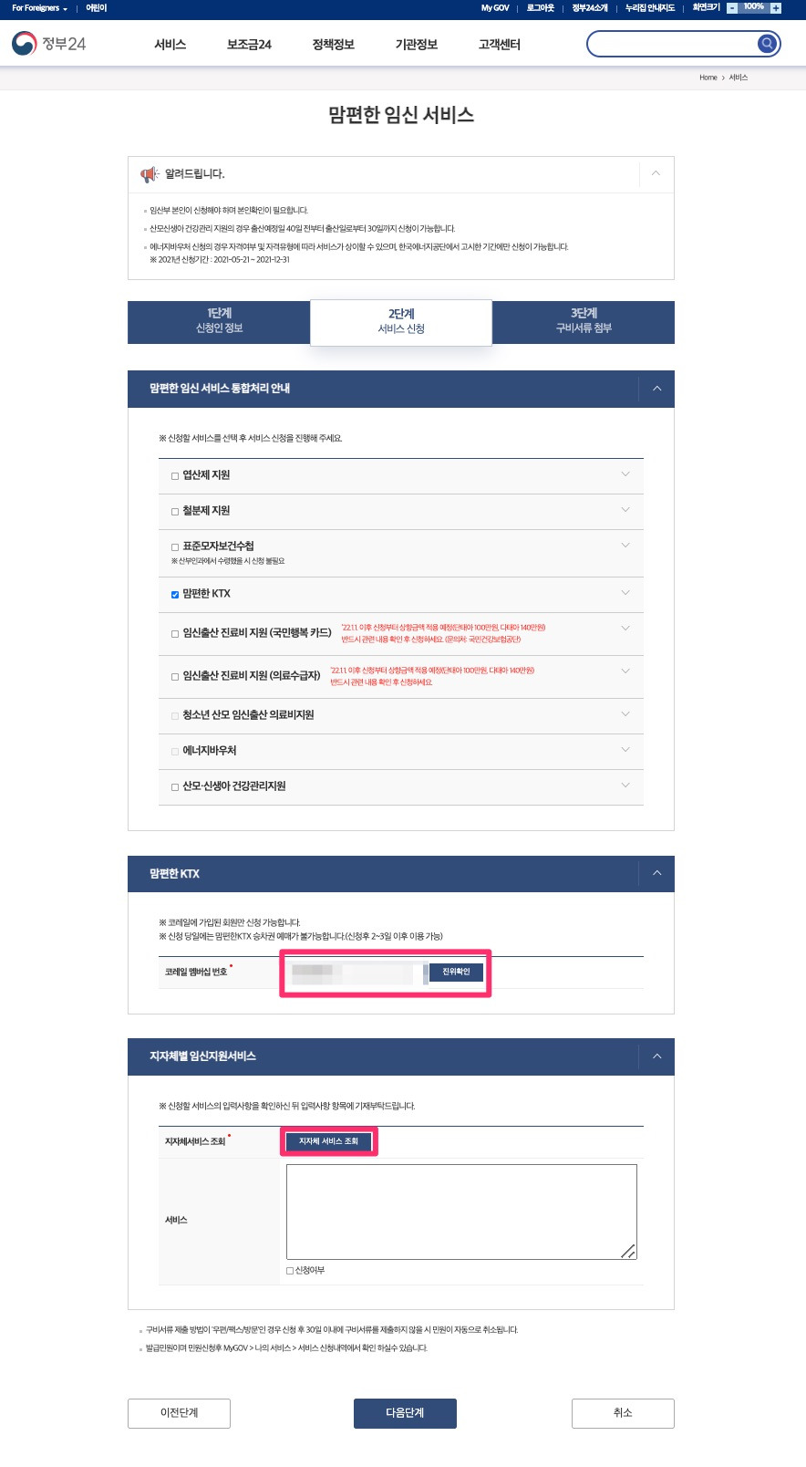 신청인 정보의 다른 정보들은 자동으로 입력되어있어서 주소만 입력했고, 임신관련 정보에서는 임신사실을 확인해 주시기 바랍니다 옆의 '조회' 버튼을 누르니 자동으로 정보가 불러와졌다. 맘편한 KTX도 아직 신청하지 않았어서 코레일 멤버십 번호를 입력해 신청했다 (임산부와 보호자 1인 좌석의 특실 업그레이드와 운임 할인권을 제공한다고 합니다).