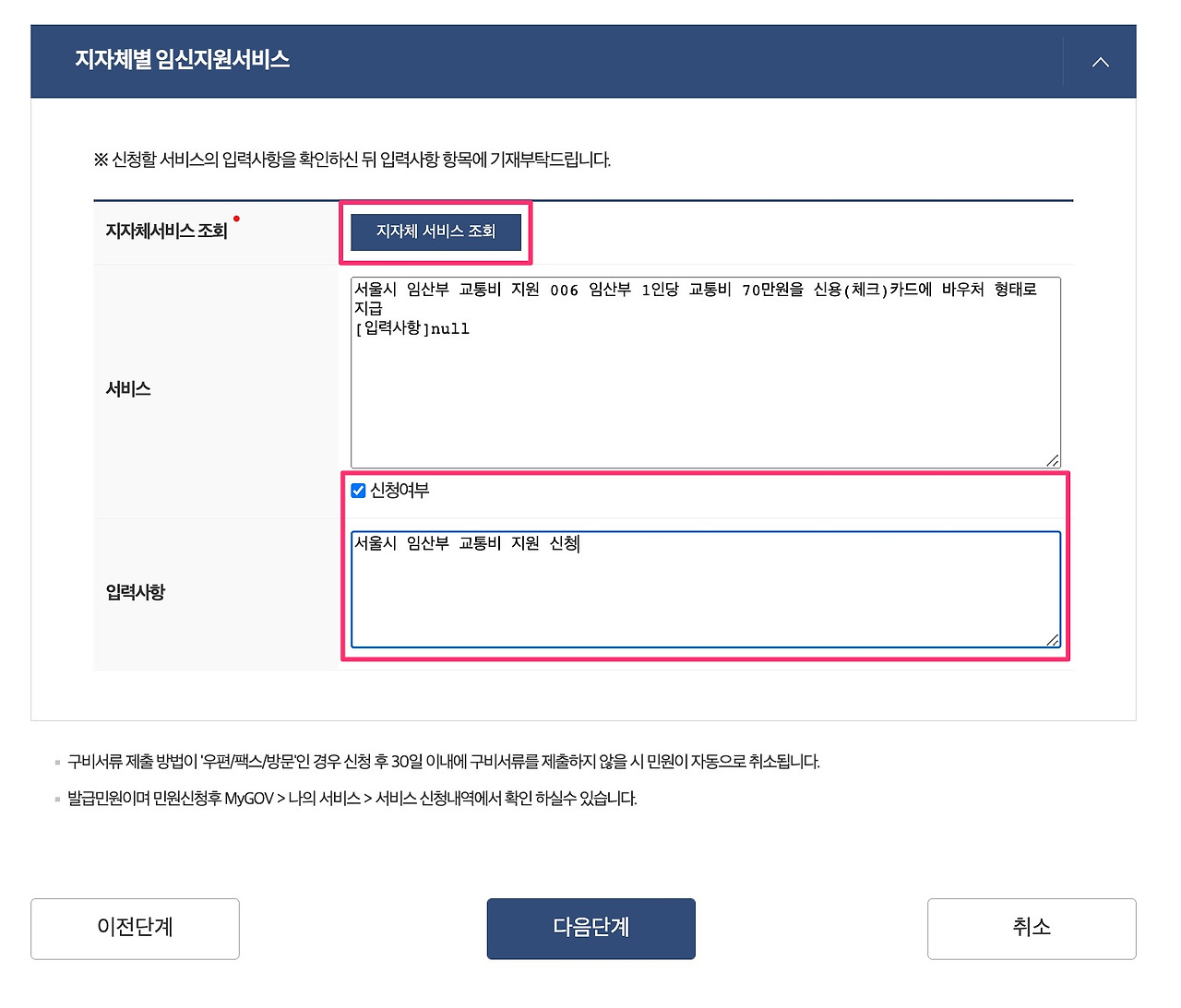 지자체 서비스 조회 버튼을 누르니 서비스 항목에 '서울시 임산부 교통비 지원...' 내용이 자동 입력되었다. 그 아래 신청여부 체크박스와 입력사항은 잘 모르겠어서 일단 체크하고 '서울시 임산부 교통비 지원 신청'이라고 기입했다.