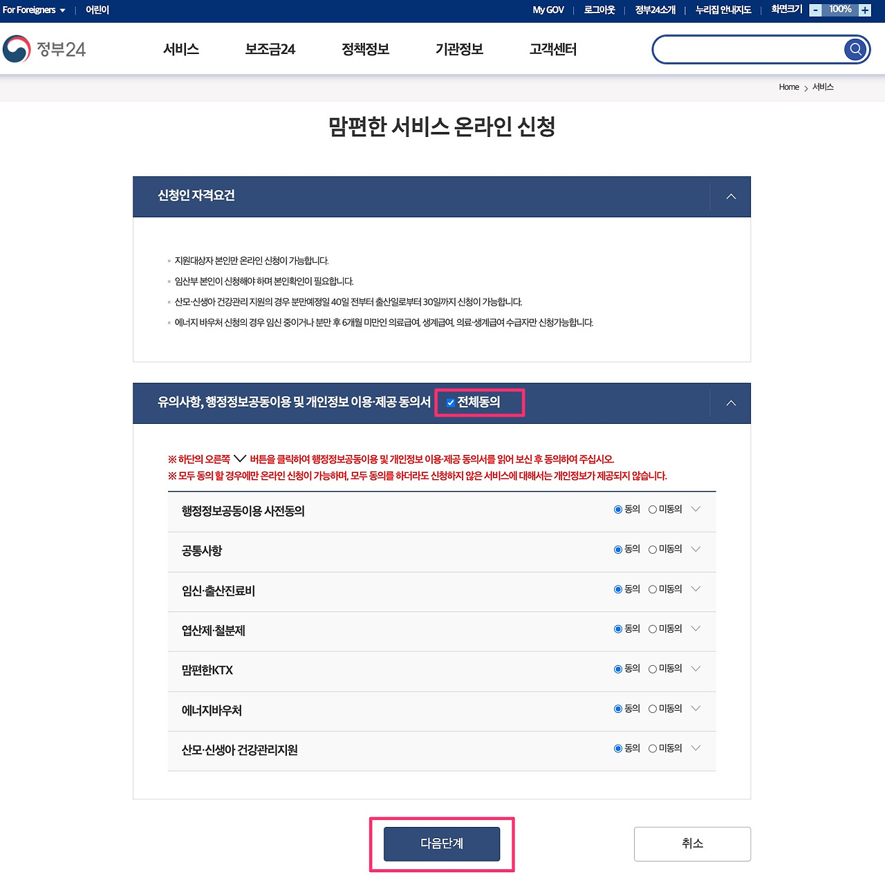 맘편한 임신 온라인 통합처리 신청을 누르고 다음 페이지에서는 일단 잘 모르겠어서 전체동의를 눌렀다.