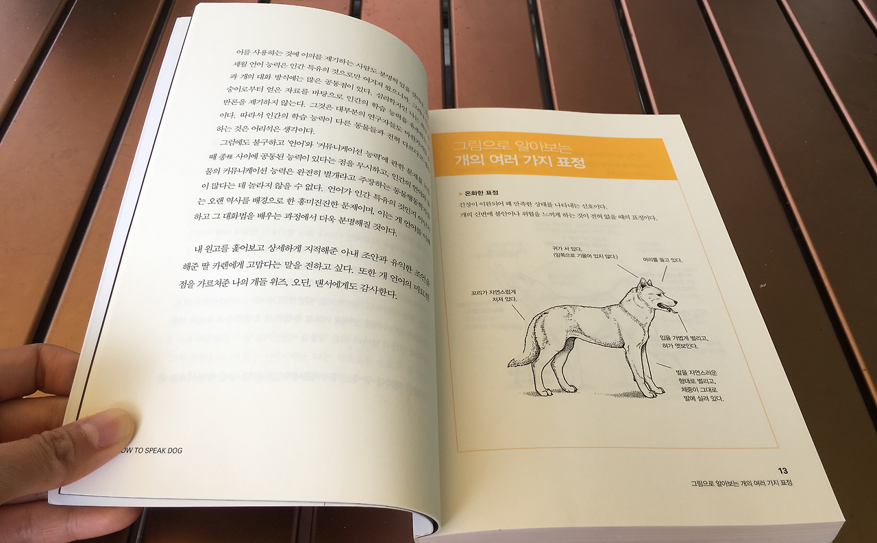 전반적으로는 강아지들의 몸동작, 짖는 소리, 낑낑대는 소리 등에서 지금 어떤 상태인지를 알려주는 책이다. 단순히 꼬리를 흔든다고 기분이 좋고 상대를 반긴다기 보다니 오히려 흥분해서, 혹은 겁을 먹어서 꼬리를 곧추 세우기도 하는데 그 차이를 강아지의 귀, 표정, 소리에서 찾아서 알려준다.