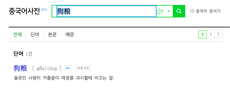 무슨 얘기하다가 나온 단어였는지 맥락은 잘 기억이 안 나지만, 개 사료는 개의 '양'식 이니까 狗粮。 양식粮食에서의 粮을 쓴다. 그런데 네이버에 다시 검색해보니 생각지도 못한 뜻이 나와서 당황스럽다. 내일 선생님한테 물어봐야지. (근데 오히려 이 말을 중국어로 못 할 것 같다.) 물어보니 인터넷에서만 쓰는 인터넷 용어라고, 알고만 있으라고 하셨다. 보통 撒狗粮이라고 쓴다고. 우리나라 말로 하면 '염장지른다' 정도의 뜻일것 같다. 虐狗도 비슷한말!