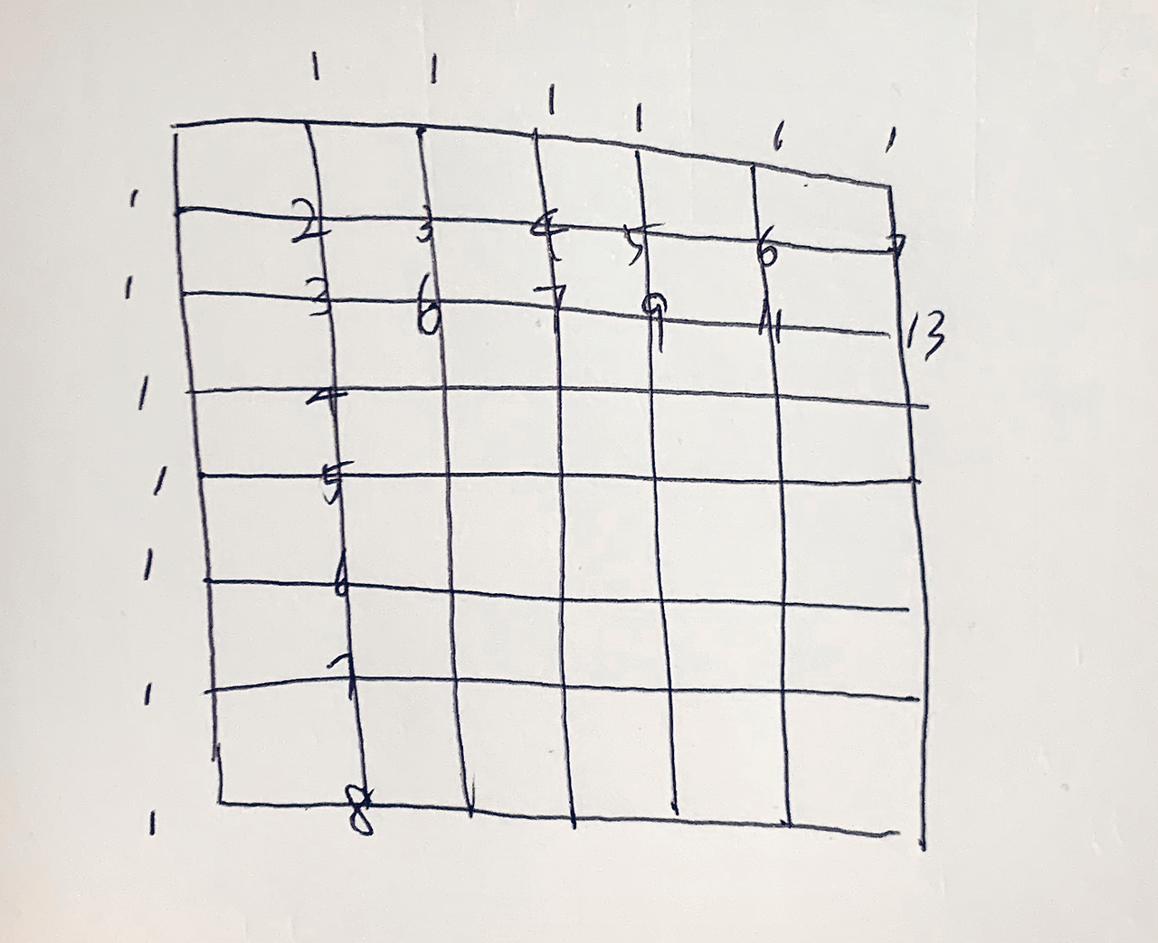 고등학교 시절, 자주 등장하던 수학 문제 중 길 찾기 문제가 있었다. 대충 네모칸이 여러 개 제시되고, 도착점까지 갈 수 있는 경우의 수가 얼마나 되는지를 계산하는 문제였다. 내가 늘 사용하는 방법은 각 모서리에 1씩 직접 적어 더하는 방법.