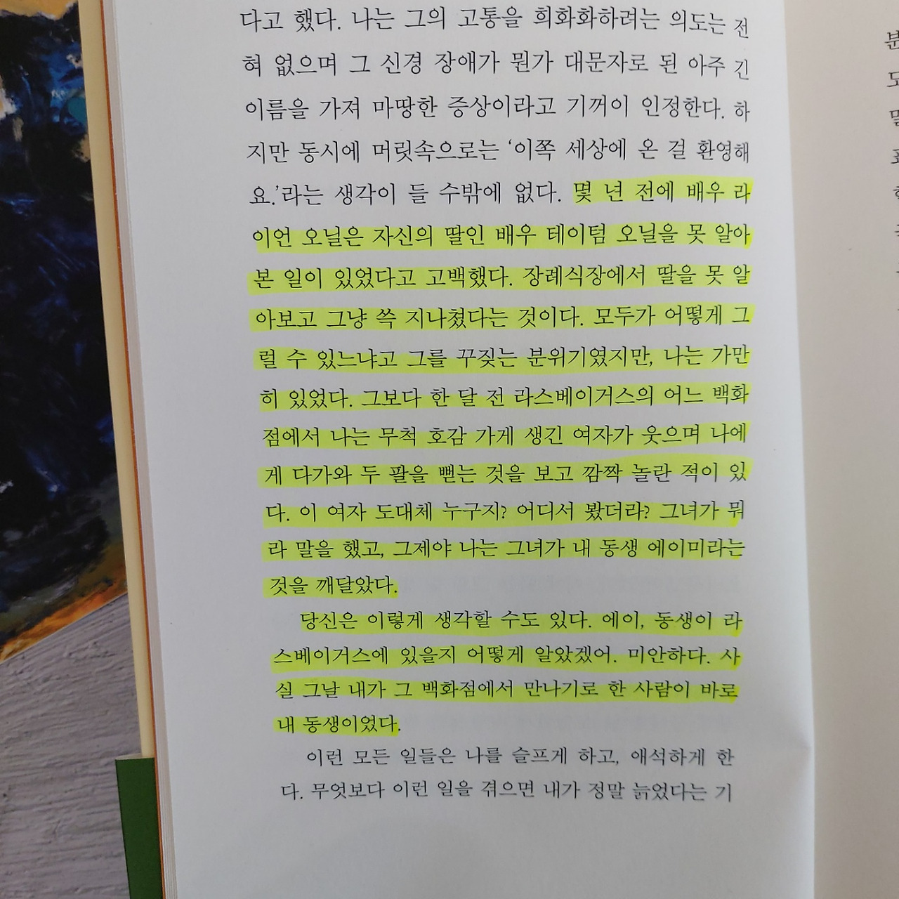 ‘몇 년 전에 배우 라이언 오닐은 자신의 딸인 배우 테이텀 오닐을 못 알아본 일이 있었다고 고백했다. 장례식장에서 딸을 못 알아보고 그냥 쓱 지나쳤다는 것이다. 모두가 어떻게 그럴 수 있느냐고 그를 꾸짖는 분위기였지만, 나는 가만히 있었다. 그보다 한 달 전 라스베이거스의 어느 백화점에서 나는 무척 호감 가게 생긴 여자가 웃으며 나에게 다가와 두 팔을 뻗는 것을 보고 깜짝 놀란 적이 있다. 이 여자 도대체 누구지? 어디서 봤더라? 그녀가 뭐라 말을 했고, 그제야 나는 그녀가 내 동생 에이미라는 것을 깨달았다.