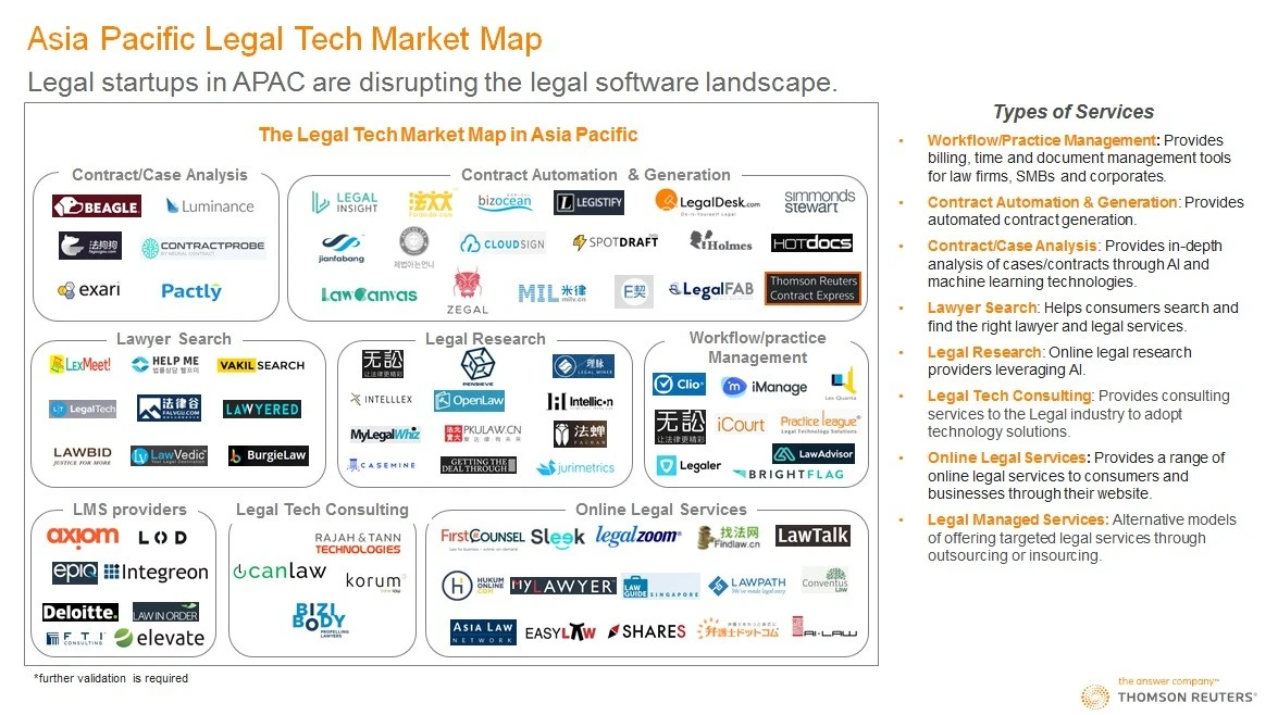 아래 차트는 현재 아시아의 리걸테크 시장들에 대해 Thomson Reuters 가 제공하는 것을 가져왔으며, 차트안에서 자세히 찾아보면, 국내 리걸테크 기업들이 있음을 알 수 있다.