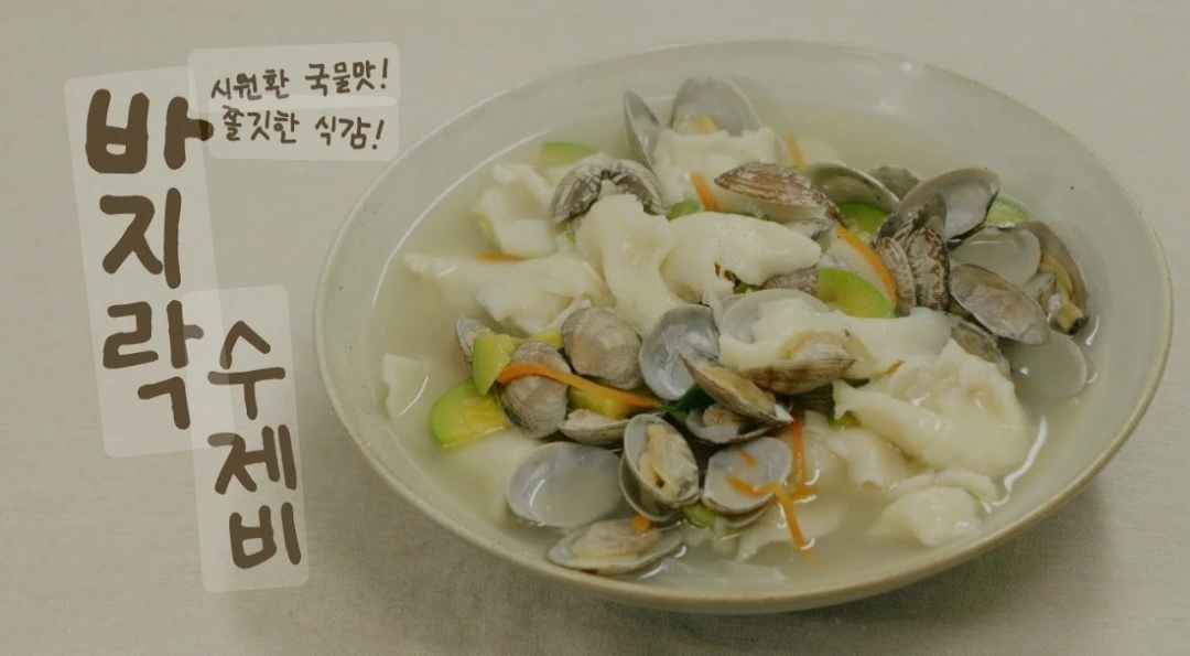 " 오랜만에 바지락 수제비 했어. 바지락 잔뜩 넣어서 밀가루를 얇게 포 떠서 끓이면 너무너무 맛있잖아. "