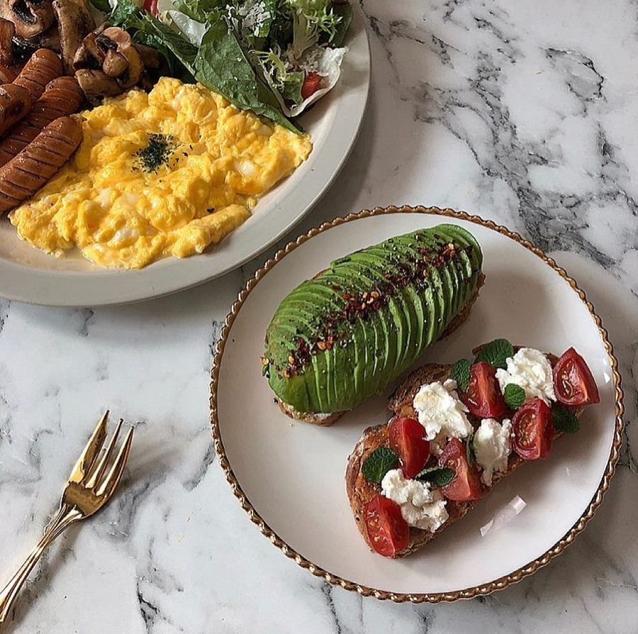 직접 만든 브런치 (그릴드 야채, 호텔식 스크램블 에그, 아보카도 오픈 샌드위치, 토마토 부라타 치즈 오픈 샌드위치)