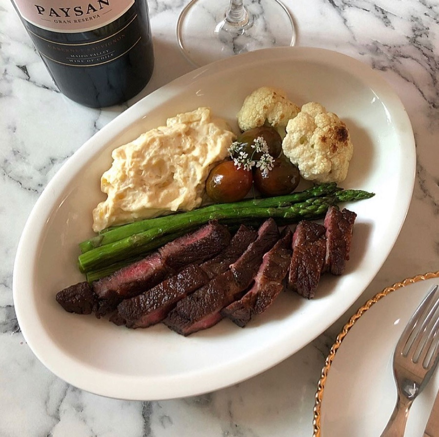 미디엄 레어 스테이크에 아스파라거스, 콜리플라워, 방울토마토, 메쉬드 포테이토를 가니쉬로 곁들였다.