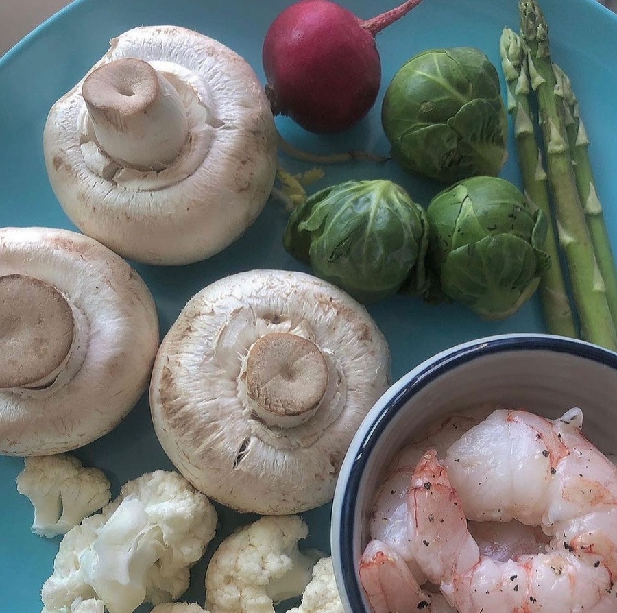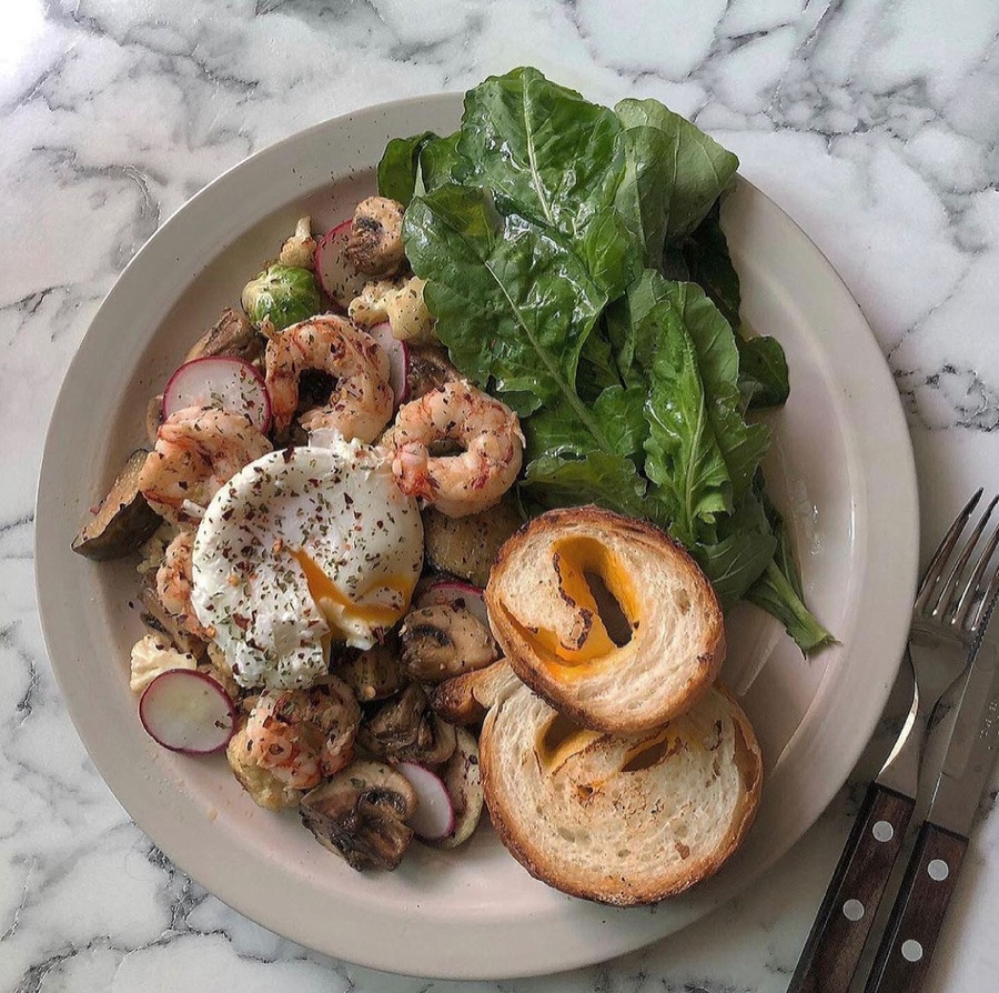 새우, 콜리플라워, 양송이버섯, 방울양배추 등을 볶아서 래디시와 루꼴라를 곁들이고 수란으로 마무리한 건강한 홈메이드 브런치