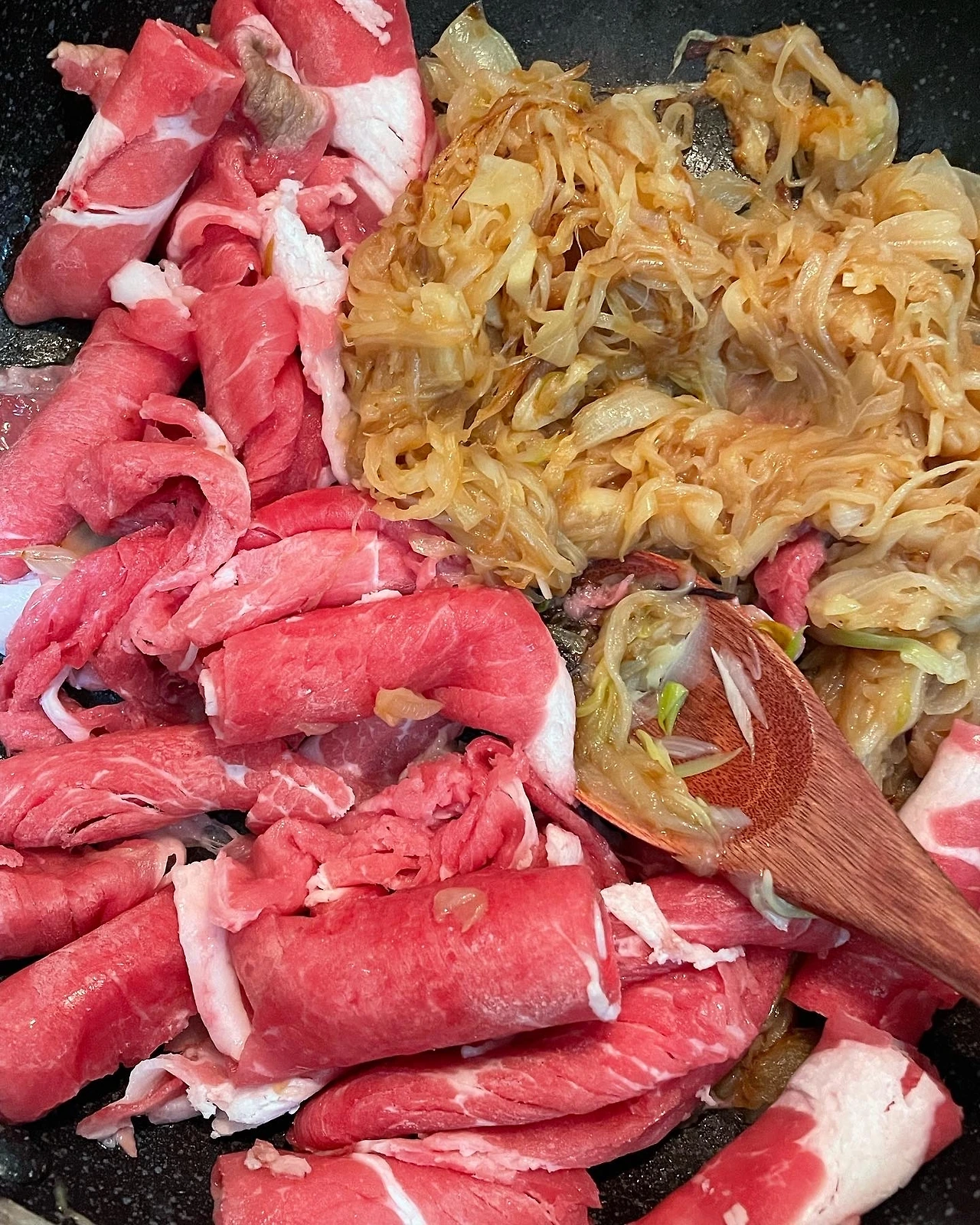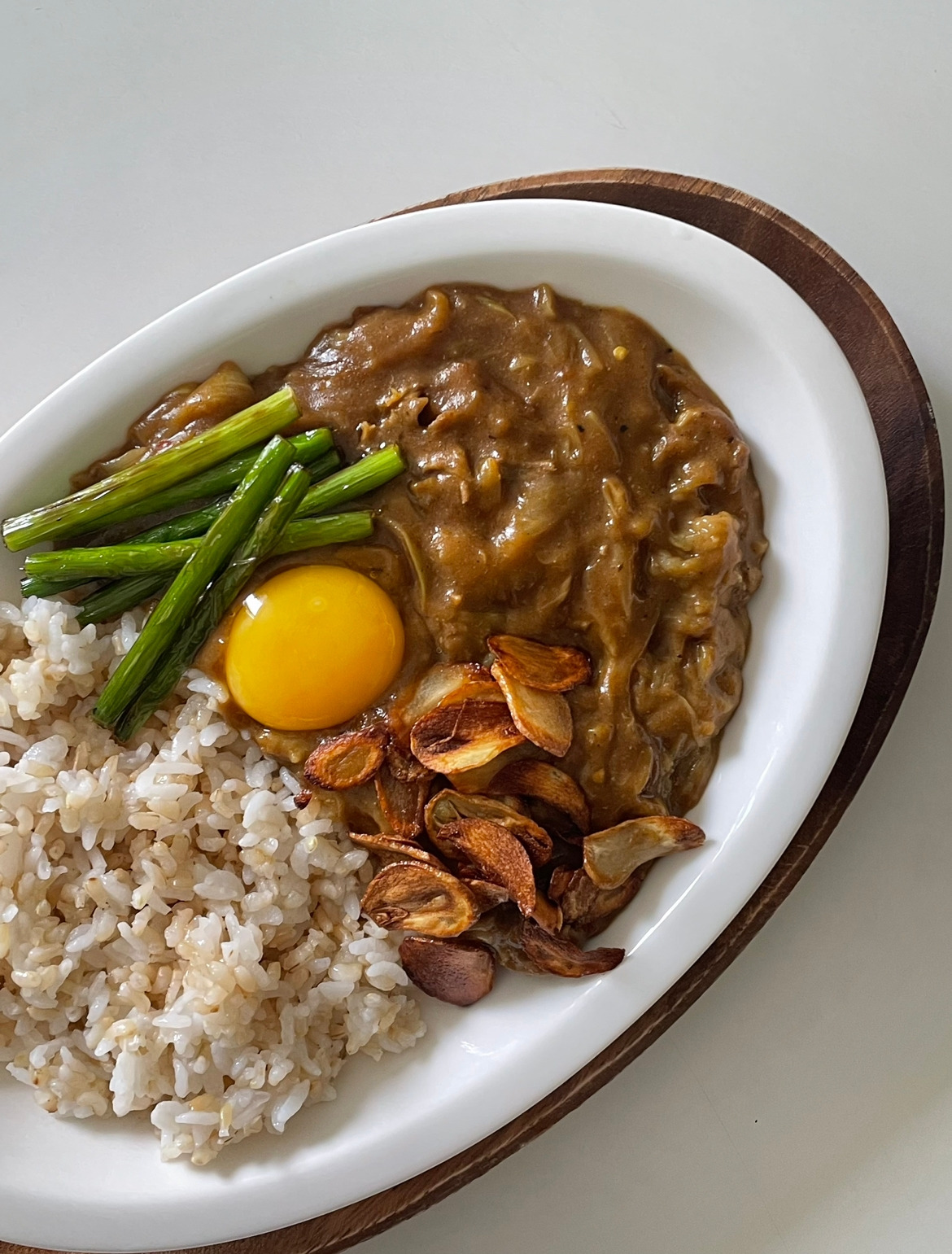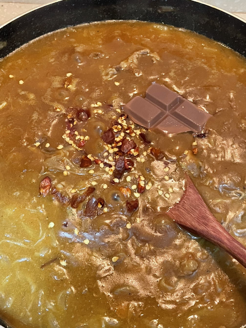 양파가 완전히 갈색빛으로 캐러멜라이징이 되었으면 그때 샤브샤브용 얇은 소고기를 넣고 함께 볶다가 물을 넣고 고체카레 블럭과 무염버터를 넣어 녹인 다음, 페퍼론치노를 부셔 넣고 마지막에 다크초콜릿을 조금 넣어주는 게 팁이다. 초콜릿이 들어가면 은은한 단맛과 감칠맛이 확 올라간다.