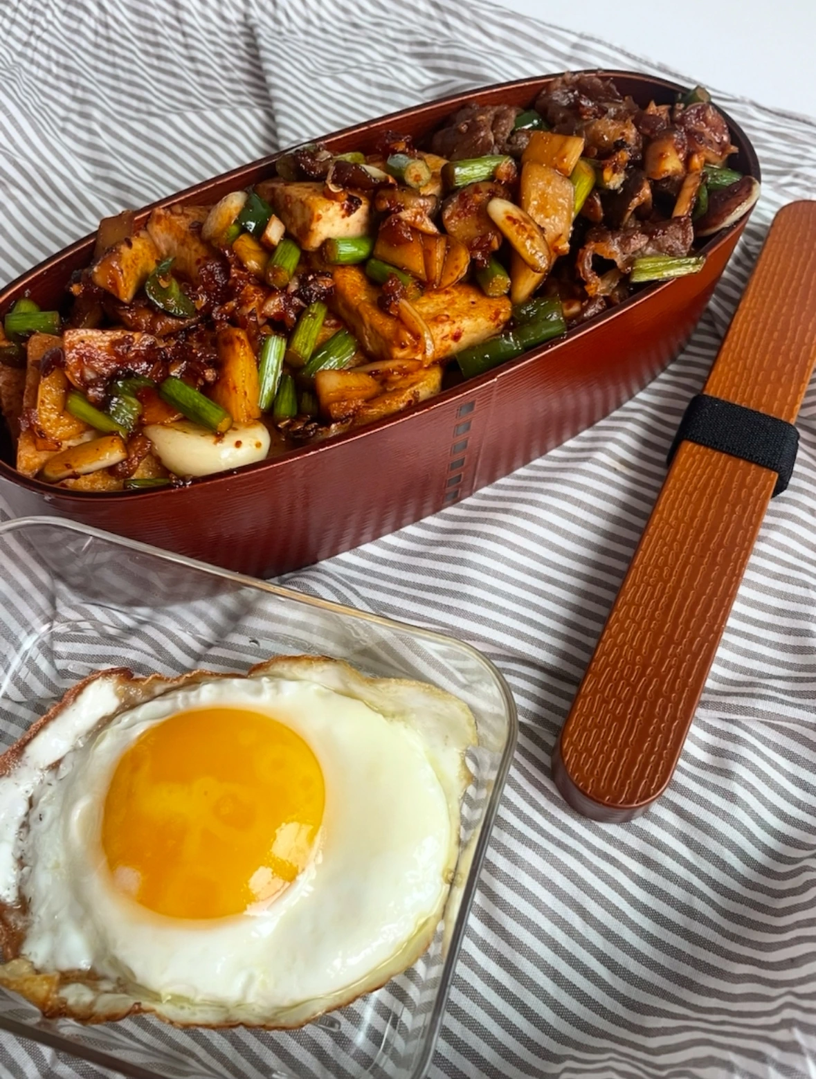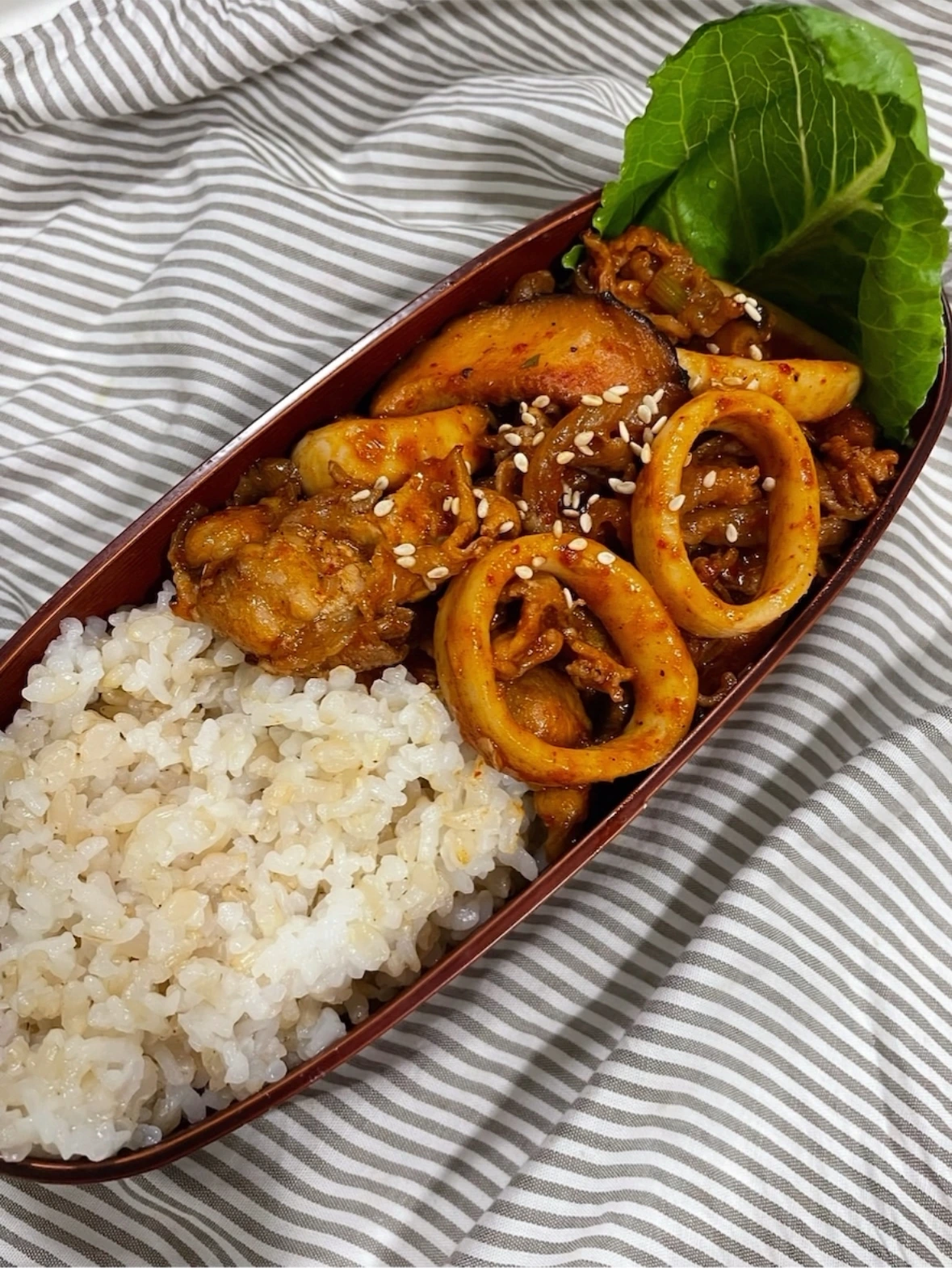 평소 파스타를 자주 해 먹었는데 파스타는 도시락을 싸는데 적합한 메뉴가 아니었고. 바닥난 체력을 끌어올리기엔 영양소가 턱없이 부족했다. 대신 삼겹살을 노릇노릇하게 굽다가 삼겹살 기름에 오징어를 볶고, 빨간 양념장을 고루 부어 준 뒤, 마무리로 향신 채소들을 넣어 휘리릭 볶아주면 단백질과 타우린이 풍부한 매콤달달 오삼불고기 덮밥이 완성된다.
