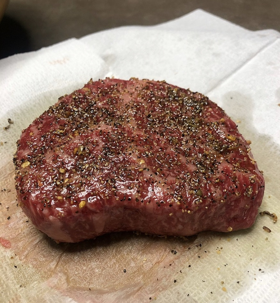 최상급 꽃등심에 마요네즈를 바르고 잔뜩 예열된 팬 위에 기름과 버터 한 통을 다 넣어 녹인 뒤 튀기듯이 구워내고 마지막에 토치질로 마무리했다.