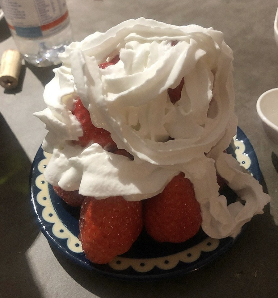 킹스베리 딸기 위에 휘핑크림을 올릴 수 있을 만큼 뿌린 센스