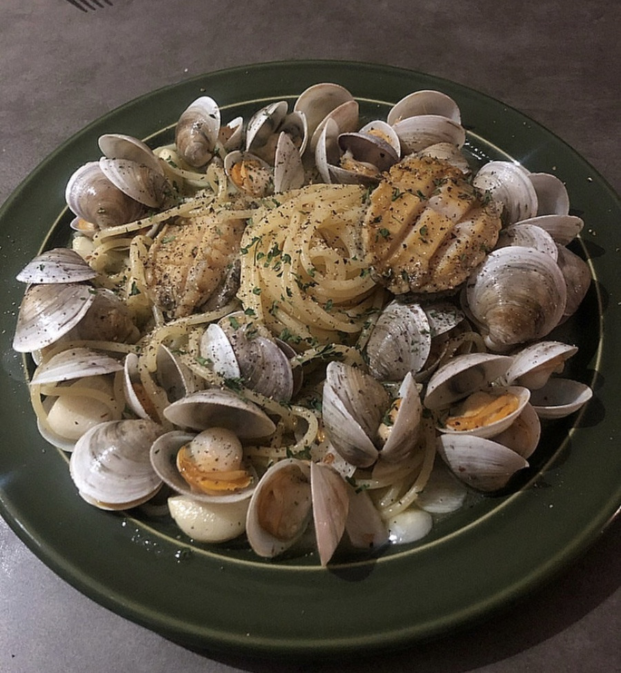봉골레 파스타에 버터구이 전복을 올렸다.
