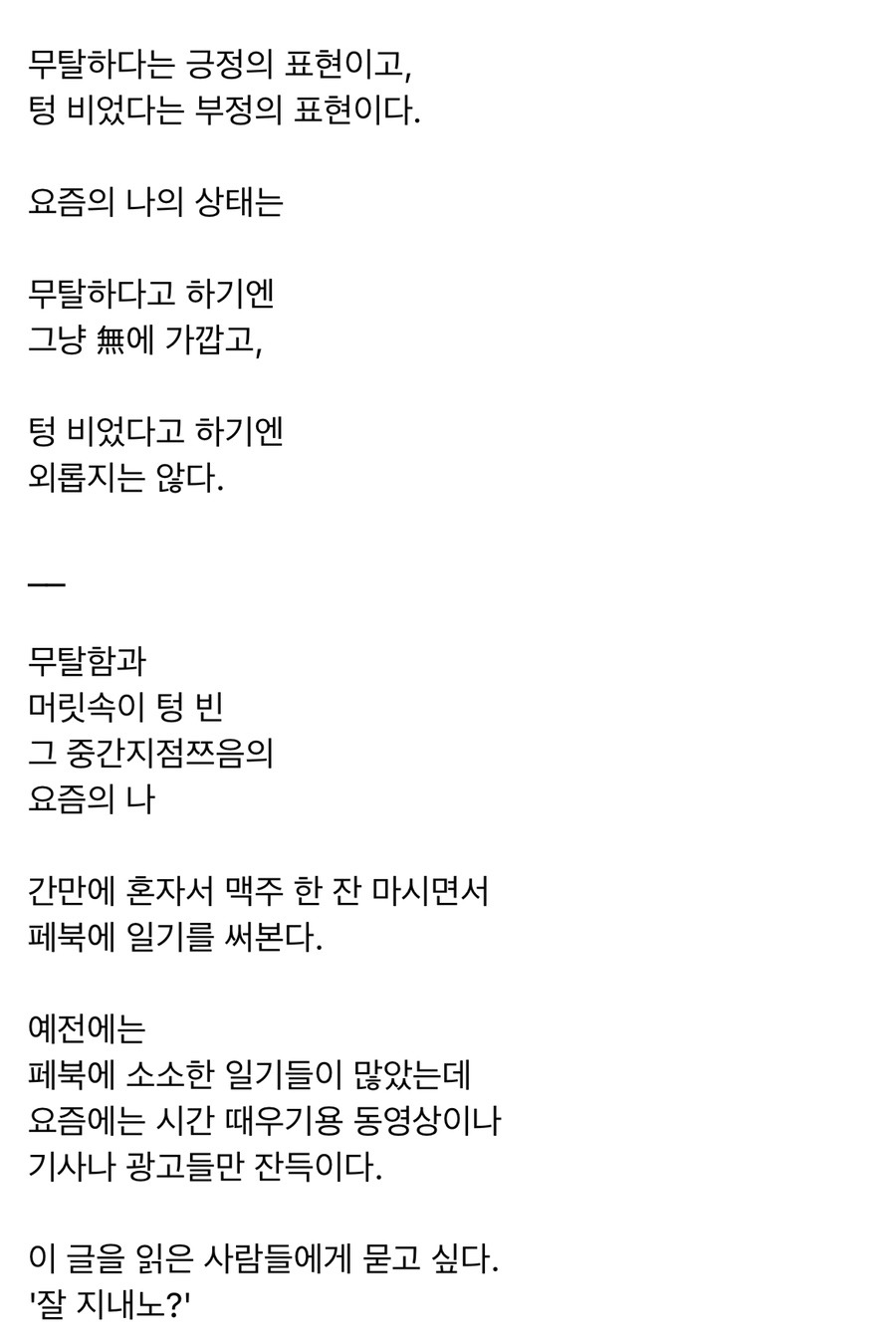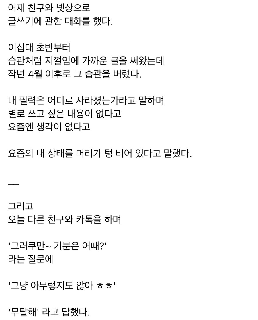 이 이후에는 실없는 이야기로 마무리되었다. 이제 보니 내 결혼식에 오지 않겠다는 그의 말속에는 분명 그 당시에 죽음을 생각하고 있었다는 걸 알 수 있었다.
