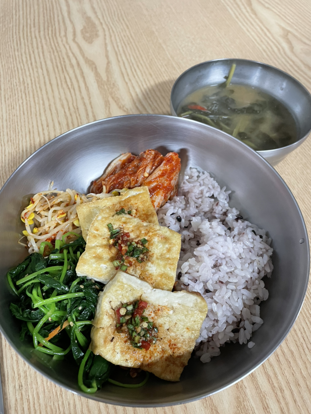 갓 지은 밥에 나물, 두부 부침, 김치, 우거짓국으로 오로지 채식으로 이루어진 소박한 저녁이었지만 감사한 마음으로 맛있게 먹었다.