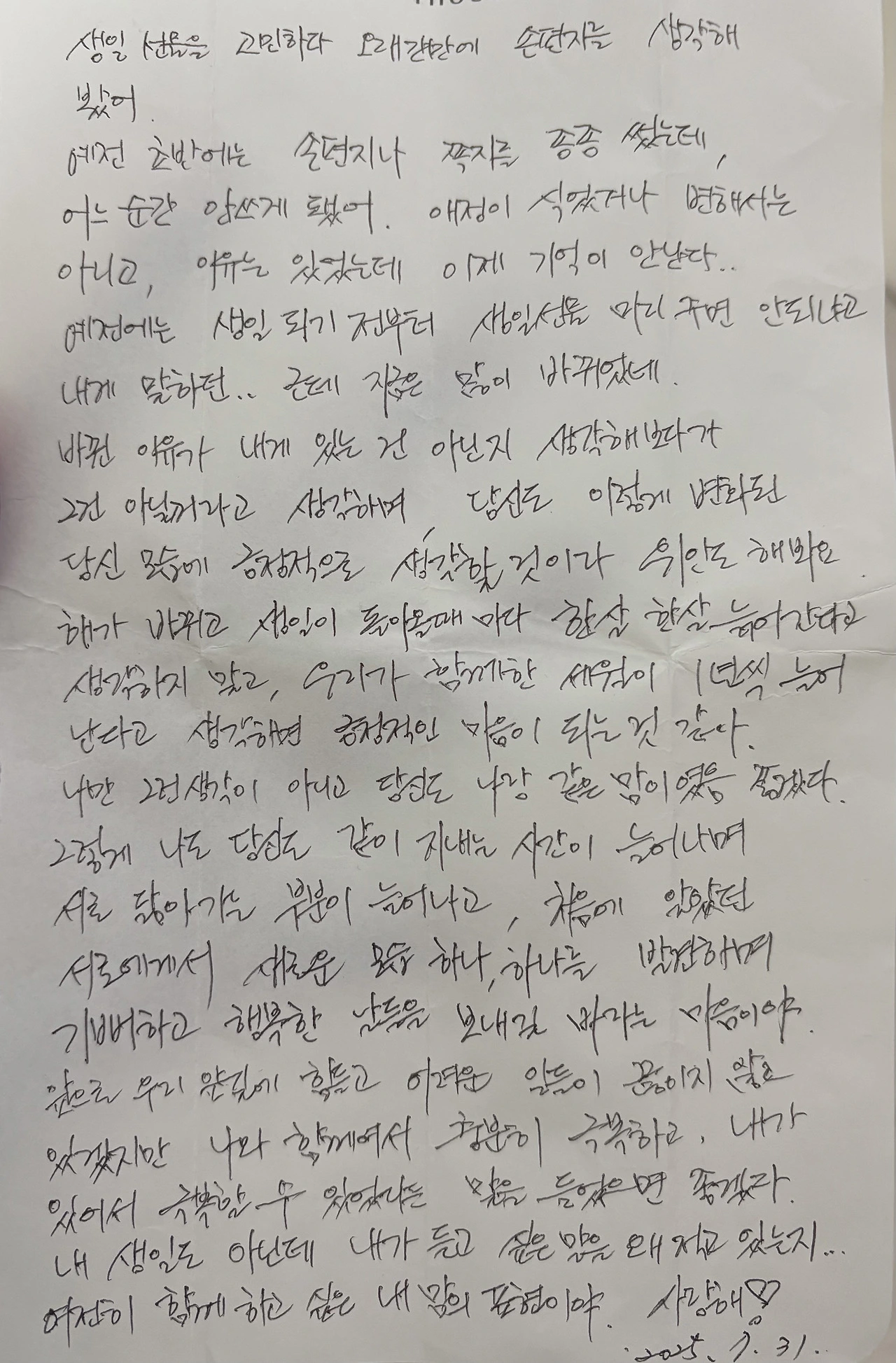 아침부터 집안을 정신없이 치웠다. 내일 어머님이 위암 추적검사를 위해 오신다고 하셨다. 어머님은 나에게 항상 따뜻하고 고마운 분이지만, 이상하게 ‘엄마’가 아닌 분을 집에 맞이한다는 것은 여전히 긴장되는 일이다. 어머님께 잘 보이려는 마음도 있겠지만, 그보다도 누군가가 우리 집에 온다는 상황 자체가 나를 예민하게 만든다. 어릴 적부터 익숙해 있던 방식과 지금의 내가 처한 관계가 다르기 때문일 것이다. 친정엄마는 온다고 해도 내가 집을 치울 일이 없었다. 엄마는 늘 와서 치우고 챙기고, 그게 자연스러운 흐름이었다. 그 기억이 떠오르니 오늘 마음이 조금 무거워졌다. 그때 화장대 정리를 하다가 접힌 쪽지 하나가 눈에 들어왔다. 내 생일날 남편이 넣어두었던 편지였다. 그땐 선물에 더 마음이 쏠려 제대로 읽지 않고 넘겼는데, 오늘은 이상하게 손이 그 종이를 펴게 됐다. 읽어 내려가는데, 생각보다 내용이 진솔했다. 남편이 왜 이런 말을 적었을까 싶은 대목도 있고, 평소 말로 잘 표현하지 않는 마음이 담겨 있어 묘한 기분이 들었다. ‘함께 살아서 다행이다’, ‘당신이 있어 덜 두렵다’ 같은 문장들이 이상하게 마음을 건드렸다. 거창한 문장이 아님에도 불구하고, 일상의 무게를 나누는 사람의 말이라는 게 전달됐다. 나는 그 자리에서 잠시 멈췄다. 너무 감성적으로 울컥했다기보다는, 쌓여 있던 긴장이 조금씩 풀리면서 자연스럽게 눈물이 났다. 어머님을 맞이해야 한다는 부담, 친정엄마의 빈자리에서 느껴지는 허전함, 내가 스스로도 잘 설명하기 어려웠던 감정들이 함께 올라왔다. 사람 마음은 가끔 이런 식으로 반응한다. 시어머니 방문 앞에서는 괜히 긴장하지만, 남편의 삐뚤한 손글씨 몇 줄에는 묘하게 마음이 부드러워진다. 아주 단순한 순간인데, 그 단순함이 오히려 힘이 된다. 오늘은 그런 날이었다. 괜히 예민하고 괜히 무겁던 마음이 쪽지 한 장에 조용히 내려앉는 날. 나는 잠깐 울었지만, 울고 나니 다시 움직일 힘이 생겼다. 아마 내일도 긴장되겠지만, 그래도 괜찮다. 어른이 된다는 건, 이런 감정들을 끌어안고 하루를 버티는 일이라는 걸 이제는 안다.