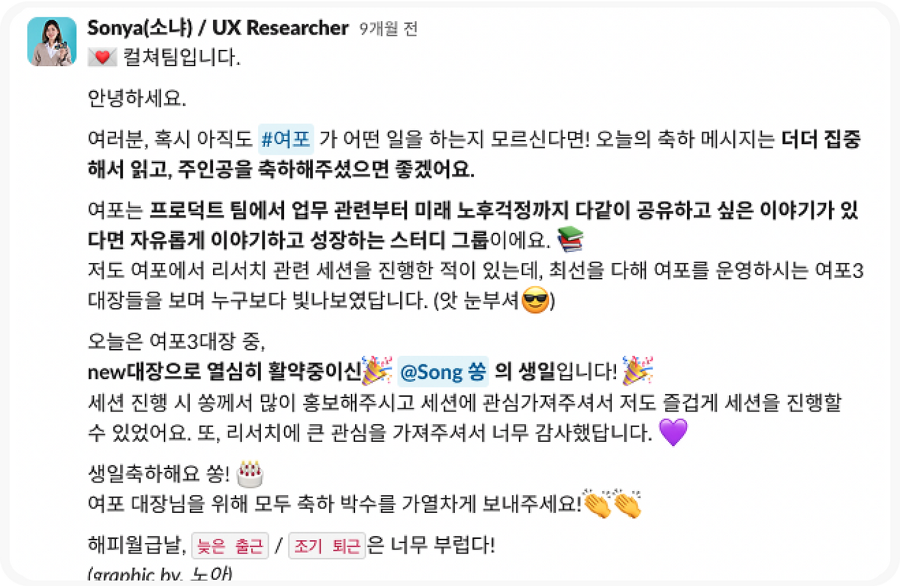 생일 축하 메시지를 읽어본 사람들은 나를 섬세하고, 다정하고, 글을 진짜 잘 쓰는 사람이라고 생각한다. 나는 내가 섬세하고, 다정하고, 글을 잘 쓰는 사람인지 몰랐다. 그렇게 평가해 주니 감사할 따름이다. 나는 나를 알리기 위한 방법으로 컬처팀을 택했고, 가장 많은 소통을 할 수 있는 생일 축하 담당을 맡았다.